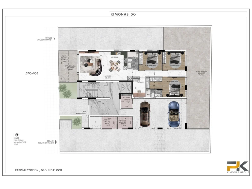 Πρόκειται για ένα τριώροφο κτίριο με συνολικά 7 διαμερίσματα τριών υπνοδωματίων. Θα αποτελείται από ένα διαμέρισμα στο ισόγειο με μεγάλη ακάλυπτη βεράντα και δύο διαμερίσματα σε κάθε όροφο. Στο διαμέρισμα του ισογείου θα γίνει εγκατάσταση φωτοβολταϊκού συστήματος 2 75KW. Όλα τα διαμερίσματα θα έχουν πρόνοια για φωτοβολταϊκό σύστημα 2 75KW. Το εν λόγω έργο εμπίπτει στις χορηγίες για ακριτικές περιοχές. It is a 3 floor building with a total of 7 three bedroom apartments. It will consist of one apartment on the ground floor with a big uncovered veranda and two apartments on each floor. In the ground floor apartment there will be installation of a 2.75KW photovoltaic system. All apartments will have provisions for a 2.75KW photovoltaic system. This project is eligible for government subsidy.