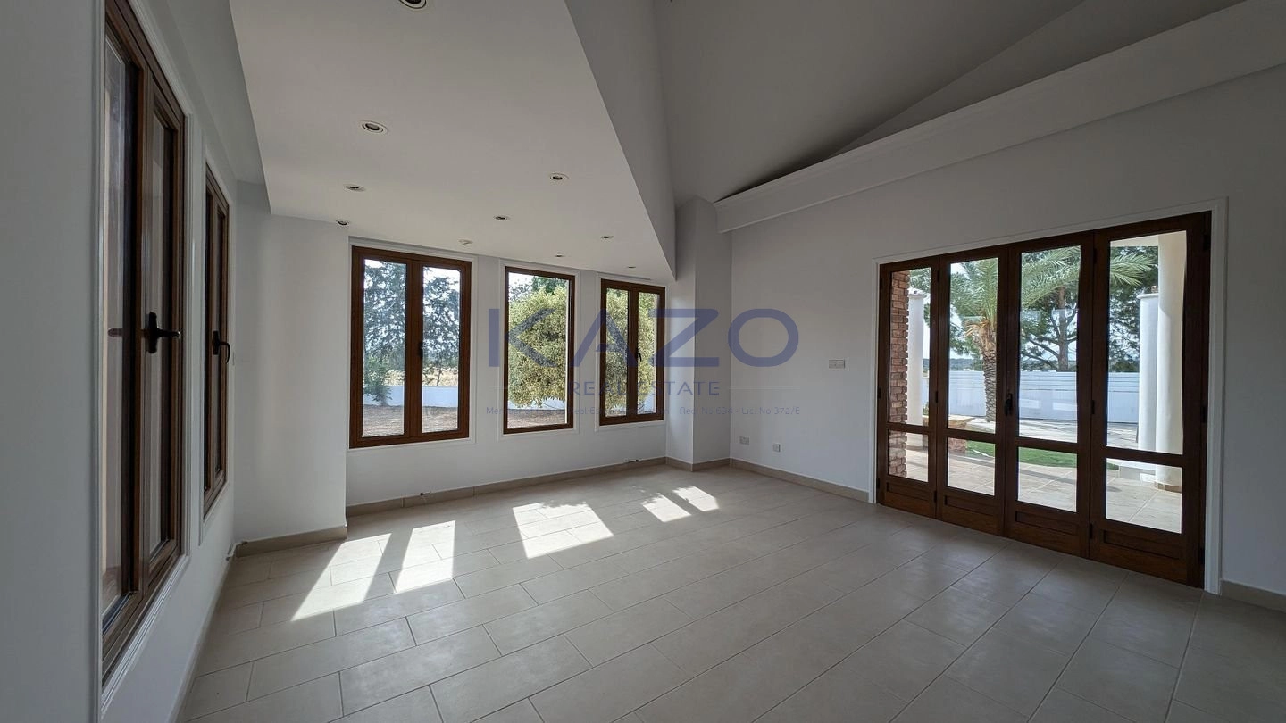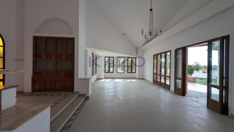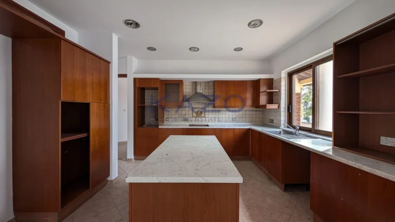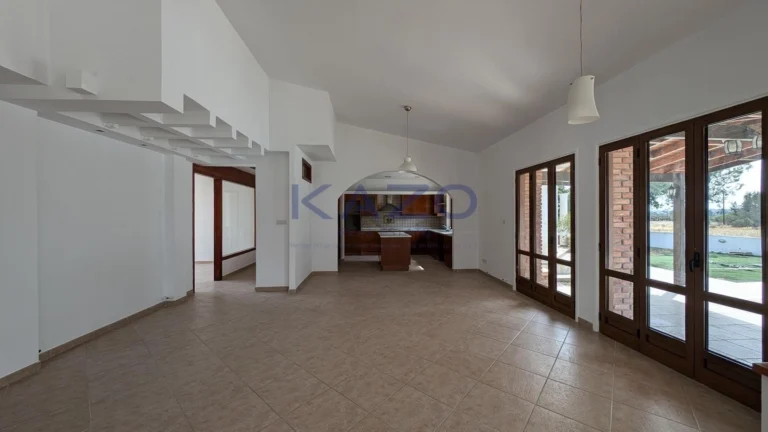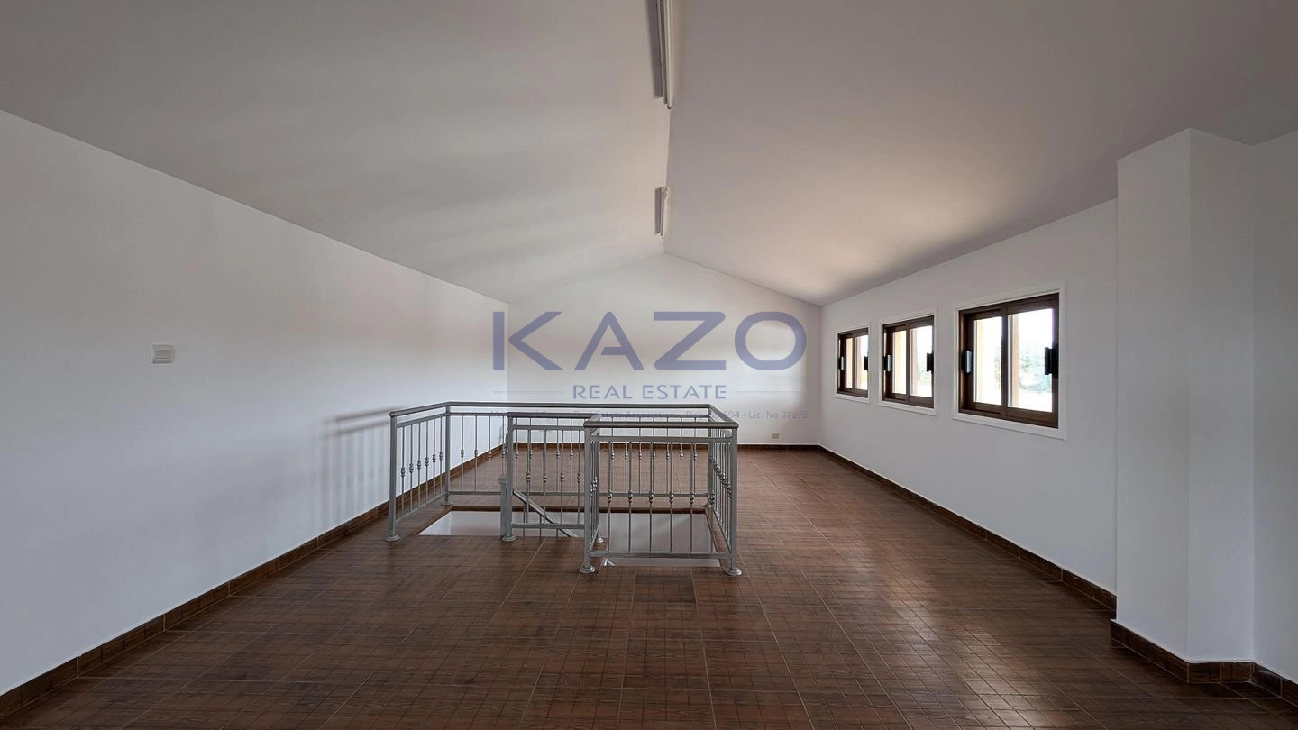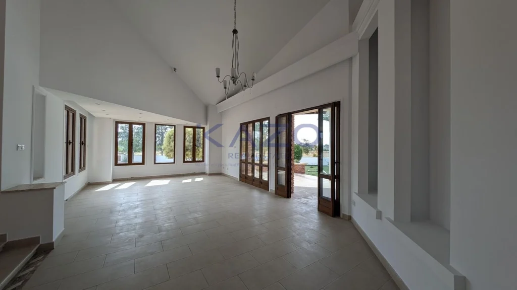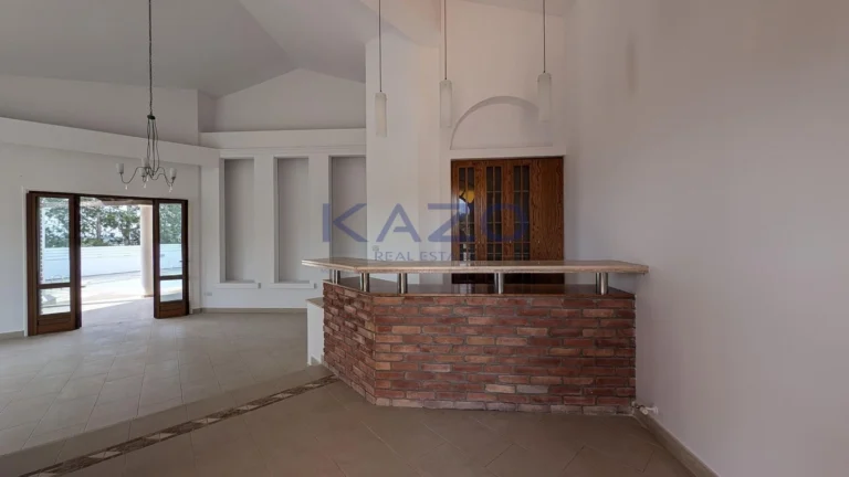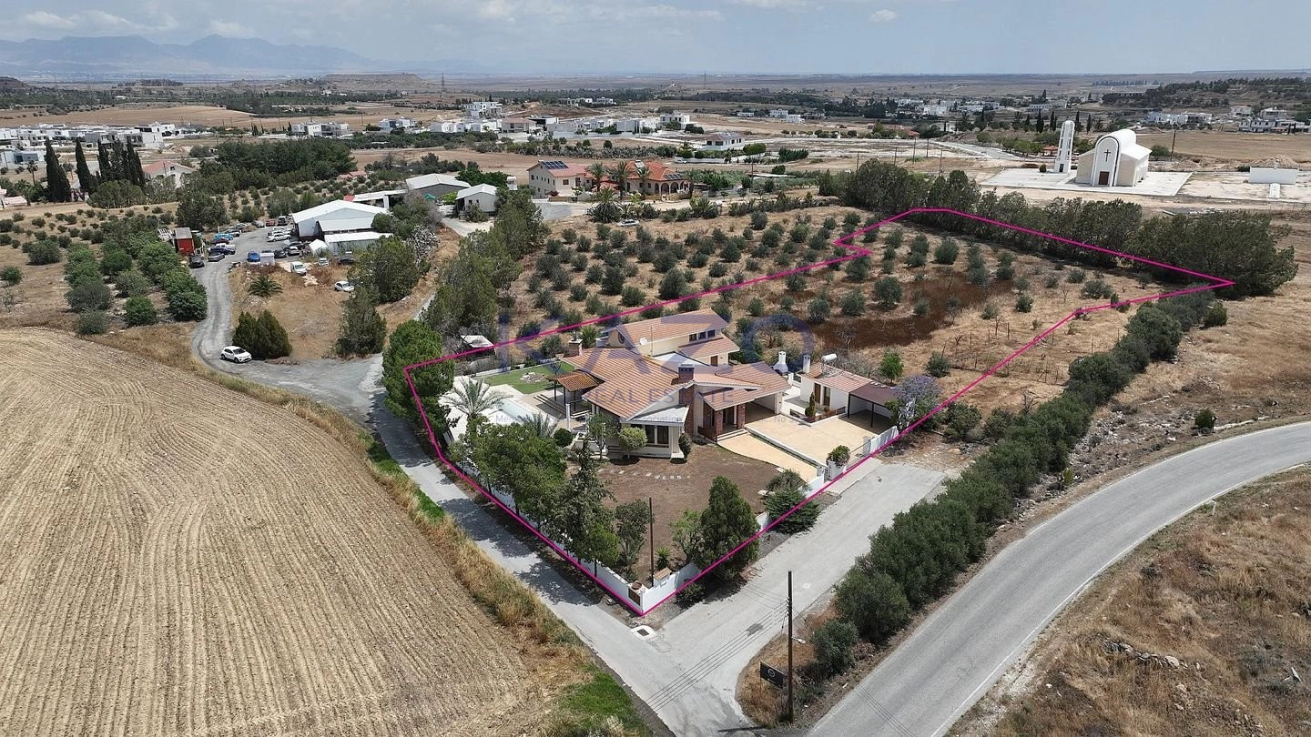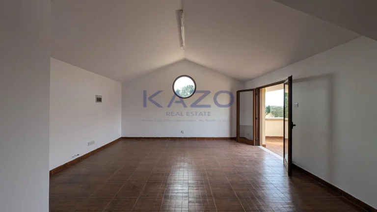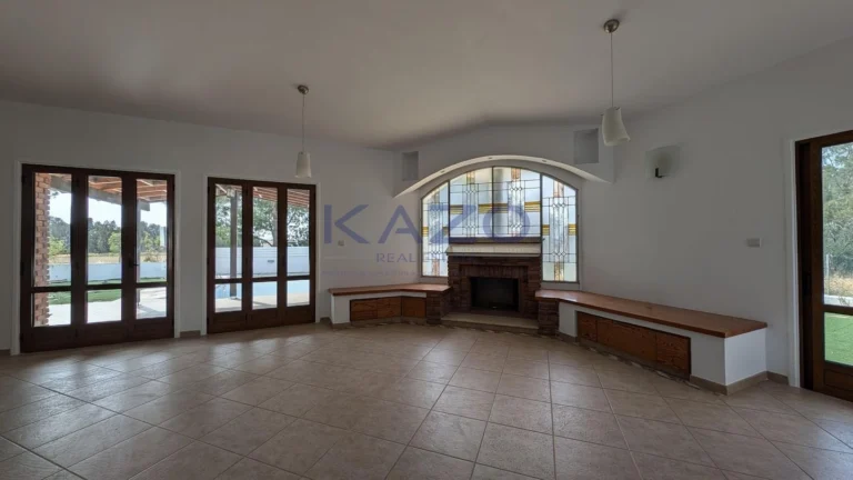 The property for sale is a luxury detached house within a large residential field of 6.076sq.m., situated in Geri, Nicosia. The ground floor of the house consists of an entrance hall, an open-plan living and dining room with a bar, a guest toilet, a kitchen, a sitting area with a fireplace, an office room, covered and uncovered verandas, a laundry room, a bathroom, and four bedrooms, with the master bedroom featuring an en-suite bathroom and a walk-in wardrobe. A staircase also provides access to the first floor, which comprises a storage area, covered and uncovered verandas. The property boasts an inviting barbecue area, a meticulously landscaped garden, storage room and a boiler room. The asset is situated approximately 1.5km outside Geri’s central community and 1.6km away from the Athalassa National Forest Park. The property falls within Zone Κα8, with a building coefficient of 60%, coverage of 35%, and permission for two floors (up to 8.3m in height). Pending issuance of Energy Performance Certificate.