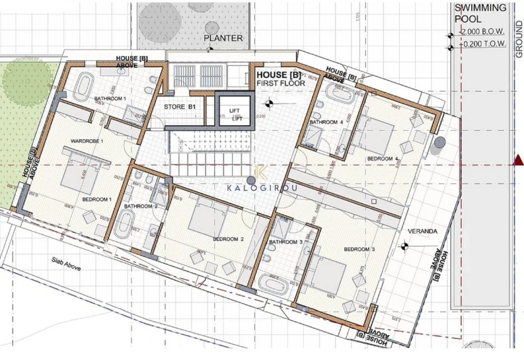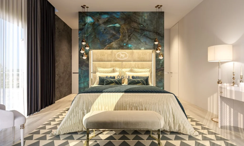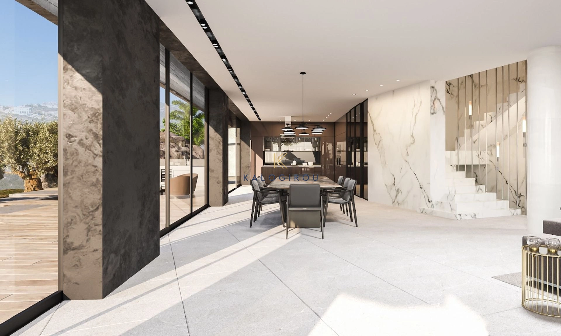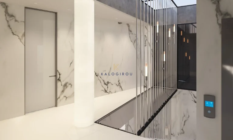Ground floor, is welcomed by a modern minimalistic open space, which comprises the living, dining area, kitchen with island, siting area, kitchenette and guest wc. All areas open up through glass doors to the veranda offering and abundance of openness. The entire ground floor follows an earth tone colour pallet combining a variety of textures and adorned with Italian marble floors and walls.