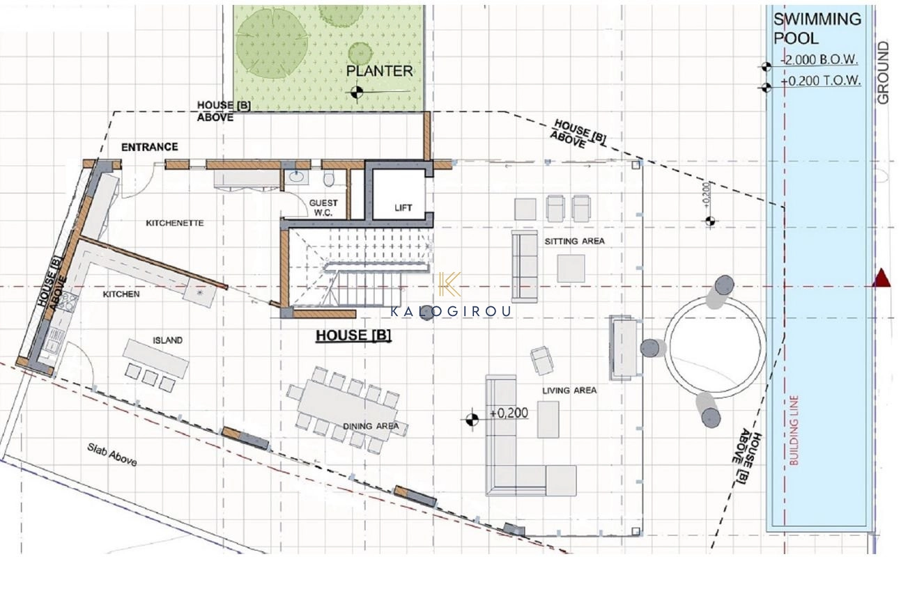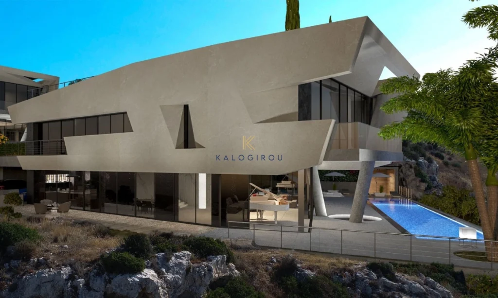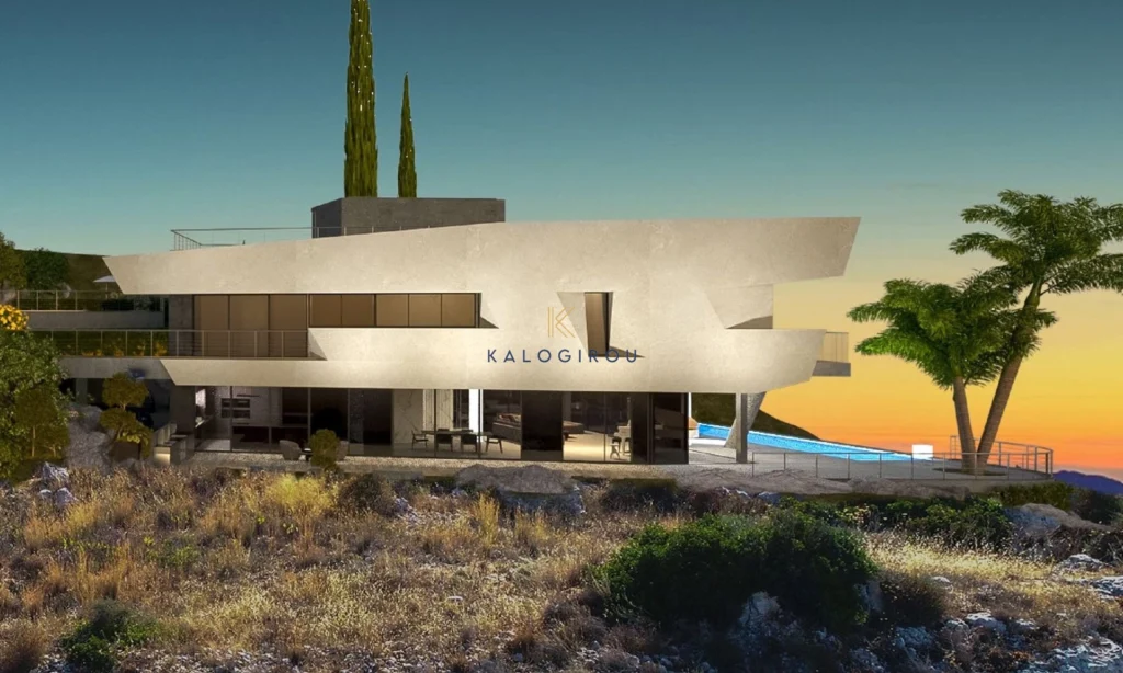 Immaculate, Six Bedroom House for sale in Agios Tychonas area, Limassol. Located on the top of the hill, it offers a magnificent view of Agios Tychonas village and surrounding mountainous areas, and the sea. Due to its uneven surface and the fact that the architect did not want to intervene with nature, the project is designed as an integral part of the landscape. What is more, the design concept has an additional detail, which makes this project unique and extraordinary.