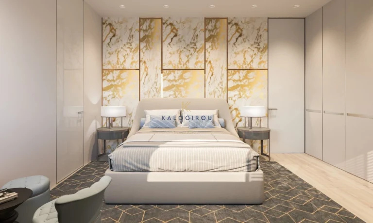 Ground floor, is welcomed by a modern minimalistic open space, which comprises the living, dining area, kitchen with island, siting area, kitchenette and guest wc. All areas open up through glass doors to the veranda offering and abundance of openness. The entire ground floor follows an earth tone colour pallet combining a variety of textures and adorned with Italian marble floors and walls.