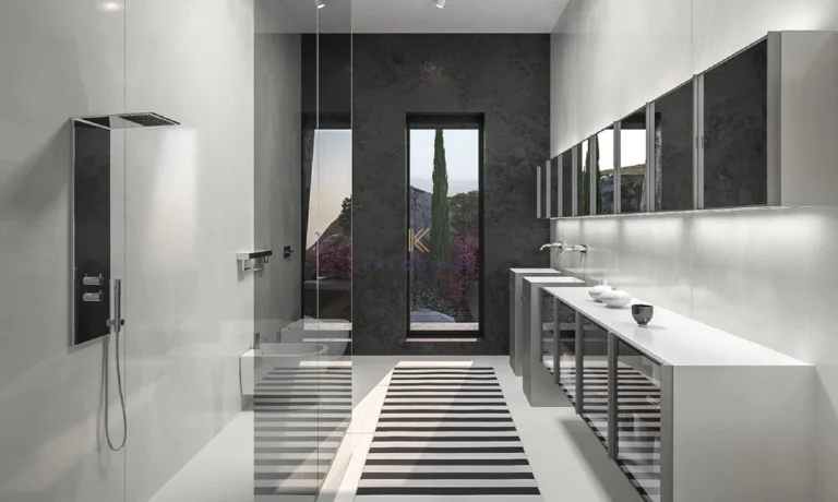 Ground floor, is welcomed by a modern minimalistic open space, which comprises the living, dining area, kitchen with island, siting area, kitchenette and guest wc. All areas open up through glass doors to the veranda offering and abundance of openness. The entire ground floor follows an earth tone colour pallet combining a variety of textures and adorned with Italian marble floors and walls.