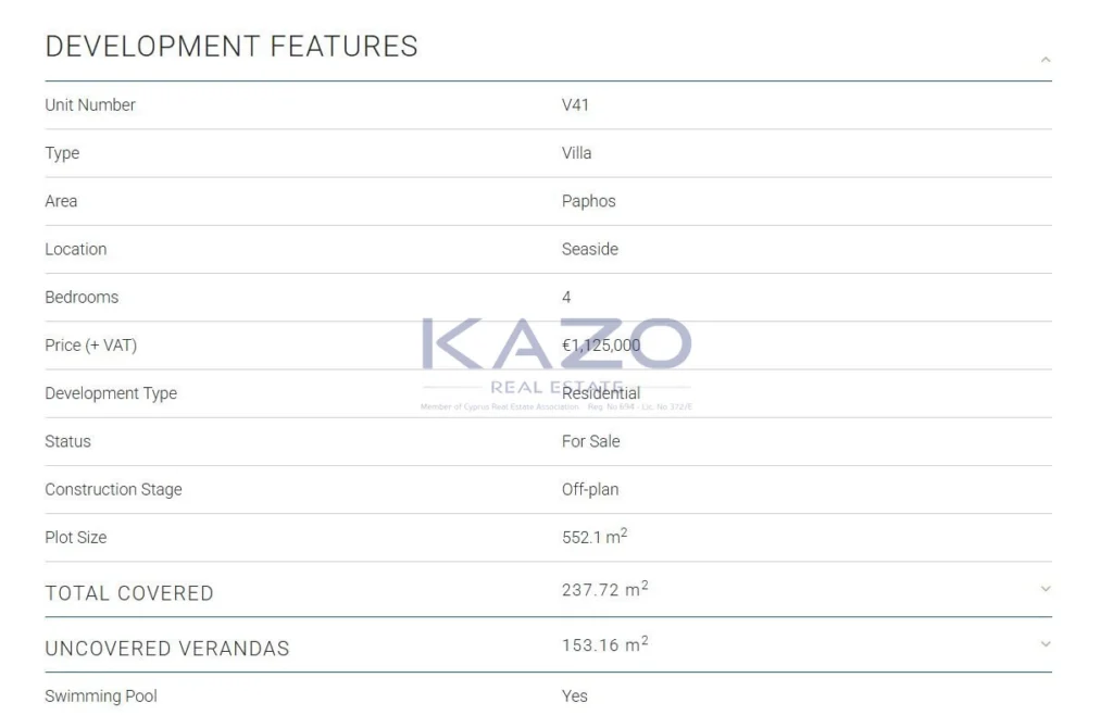 For sale: An impressive off-plan villa offering modern living in the desirable area of Geroskipou. This spacious home features 237 m² of internal space, thoughtfully designed for comfort and functionality. With four generous bedrooms and three elegant bathrooms, it is perfect for families seeking both privacy and relaxation.