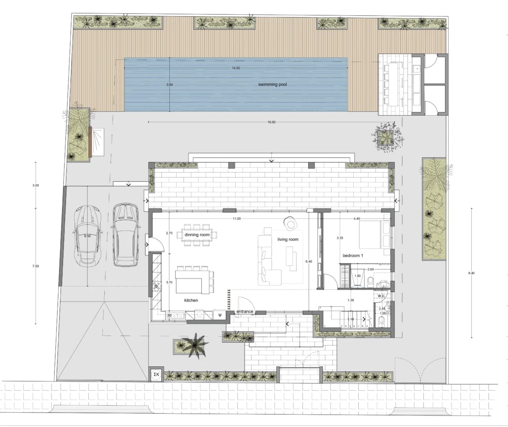 Spread across a generous plot of 600 square meters, Oroklini Hills Villa presents a spacious and well-thought-out layout. Open design kitchen featuring a stylish island, seamlessly flowing into the dining area and a spacious living room. Airy verandas, an inviting BBQ area, and an outdoor shower, complemented by a magnificent 13-meter-long swimming pool.