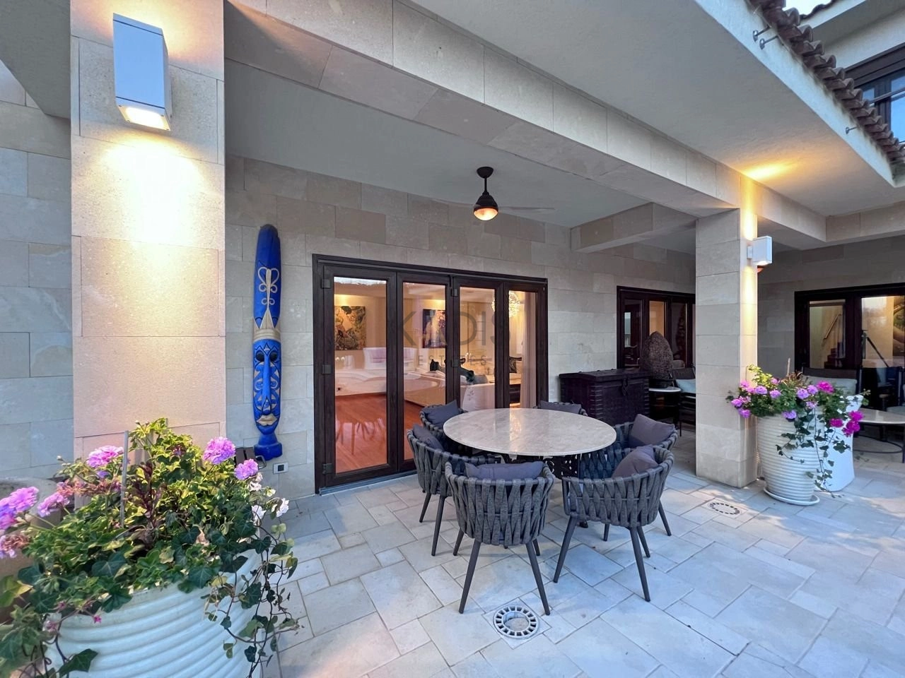 The villa offers five generously sized bedrooms, including a lavish master suite with en-suite bath and private balcony. An additional office space provides a quiet area for working from home, while a maid’s room and laundry room offer added convenience.