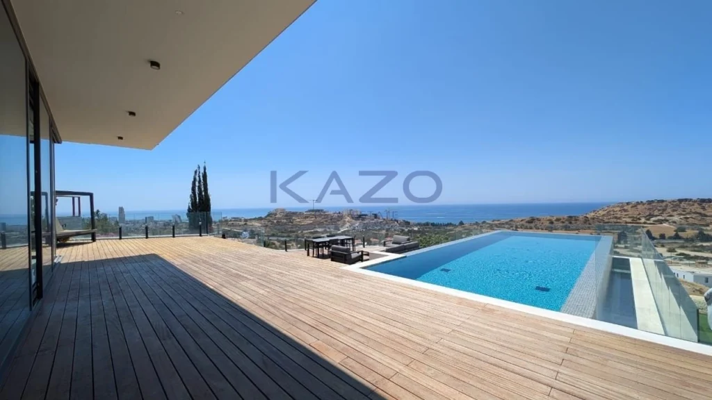 Outdoors, a private swimming pool invites you to relax while enjoying the stunning views. This villa offers panoramic, sea, mountain, and country views that fill the home with natural beauty from sunrise to sunset.