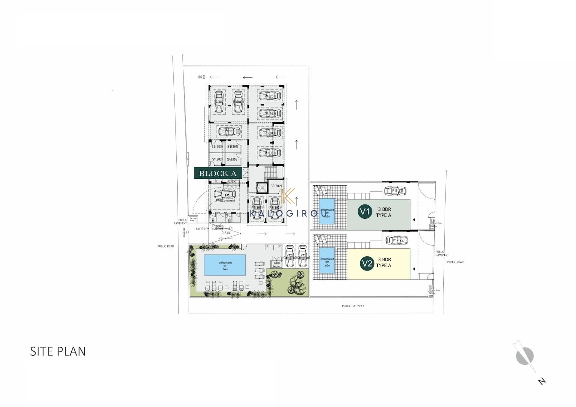 This contemporary project boasts a triple- storey apartment building with common pool and two 3-bedroom villas, each villa with private pool. On the ground level of the apartment building there are private parking spots for every apartment, men & women wc and changing rooms & the swimming pool.