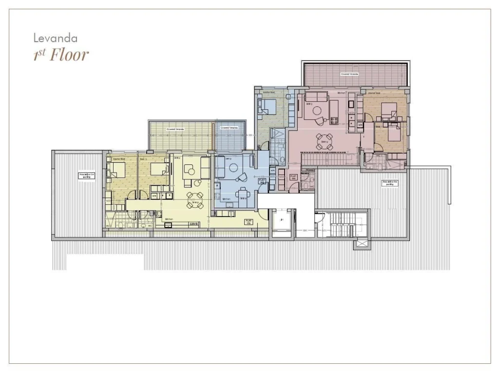 Apartment 101 Levanda is a 2-bedroom unit located on the 1st floor with additional space on the lower ground floor. It offers 139 m² of internal area and 61.8 m² of utility space.