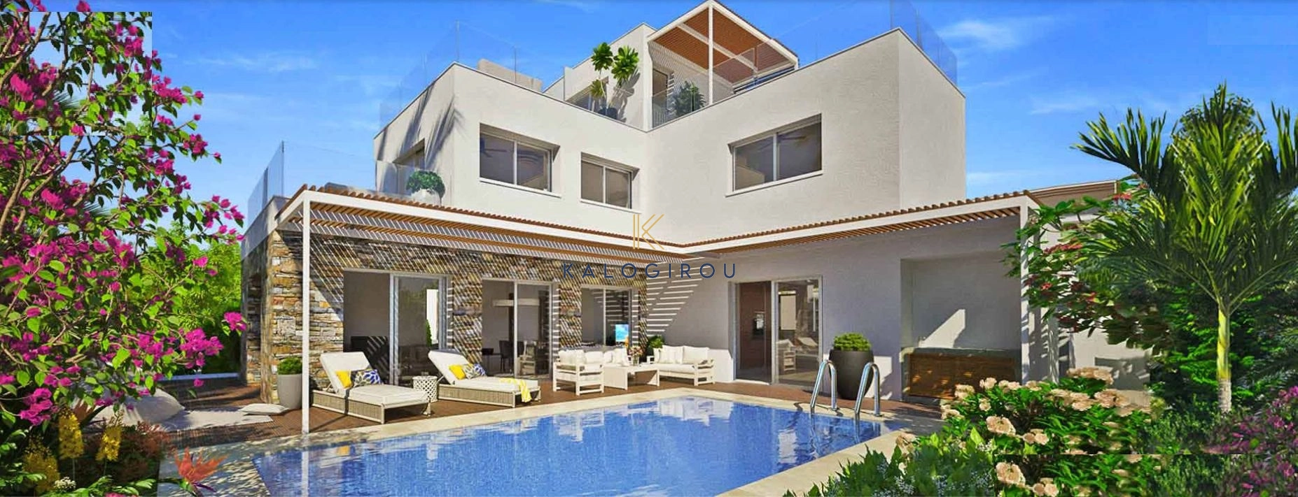 Amazing, 4 Bedroom Villa for sale in Tourist area of Geroskipou, Paphos. The development is located 250 meters from one of one of the most famous sandy beaches in Paphos and enjoys easy access to a variety of restaurants, pubs, beach bars, 5-star hotels, the Paphos waterpark and the Kings Avenue Mall.