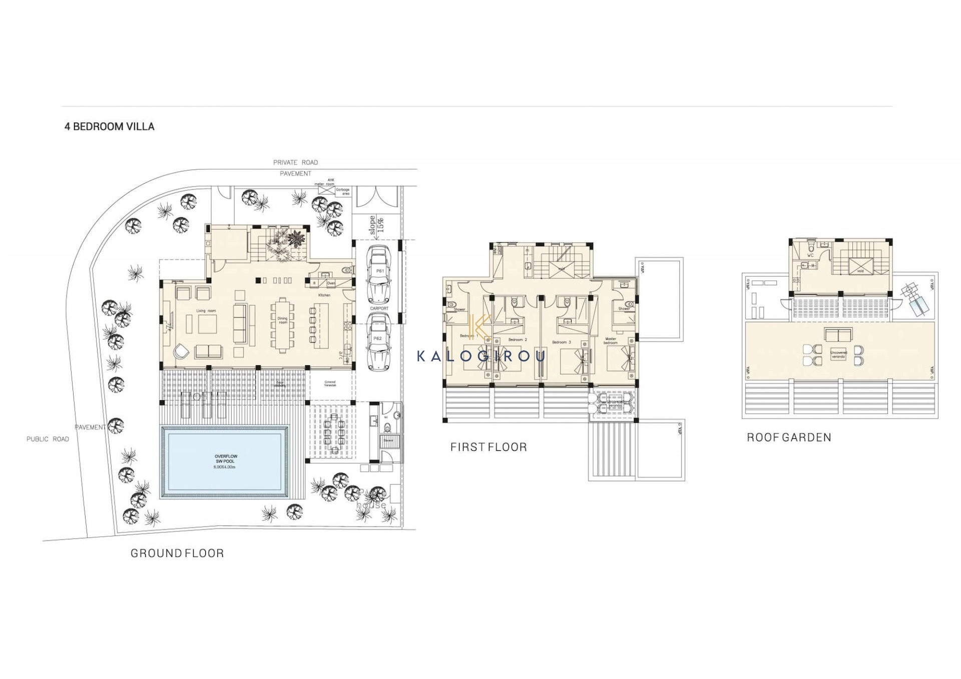 Double storey for sale in Geroskipou area, Paphos. On the ground floor there is a kitchen with island, dining, living area in a large open plan layout and a guest toilet. The first floor consists of a laundry station and 4 bedrooms, all of them en suite with shower and wc. The primary bedroom has also access to an uncovered veranda. The roof top consists of a small enclosed area, a guest wc and the spacious roof garden.