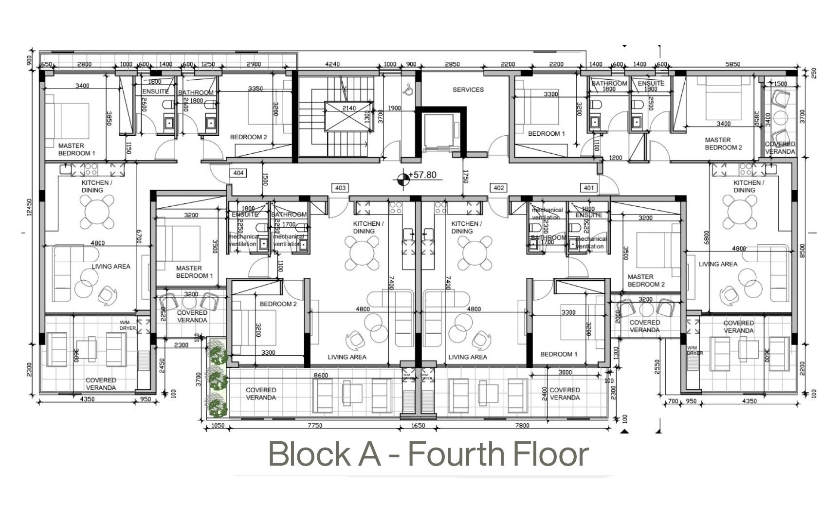 Apartment 404 is a two-bedroom unit with 90 m² of living space, situated on the 4th floor of a four-story residential building in Block A.