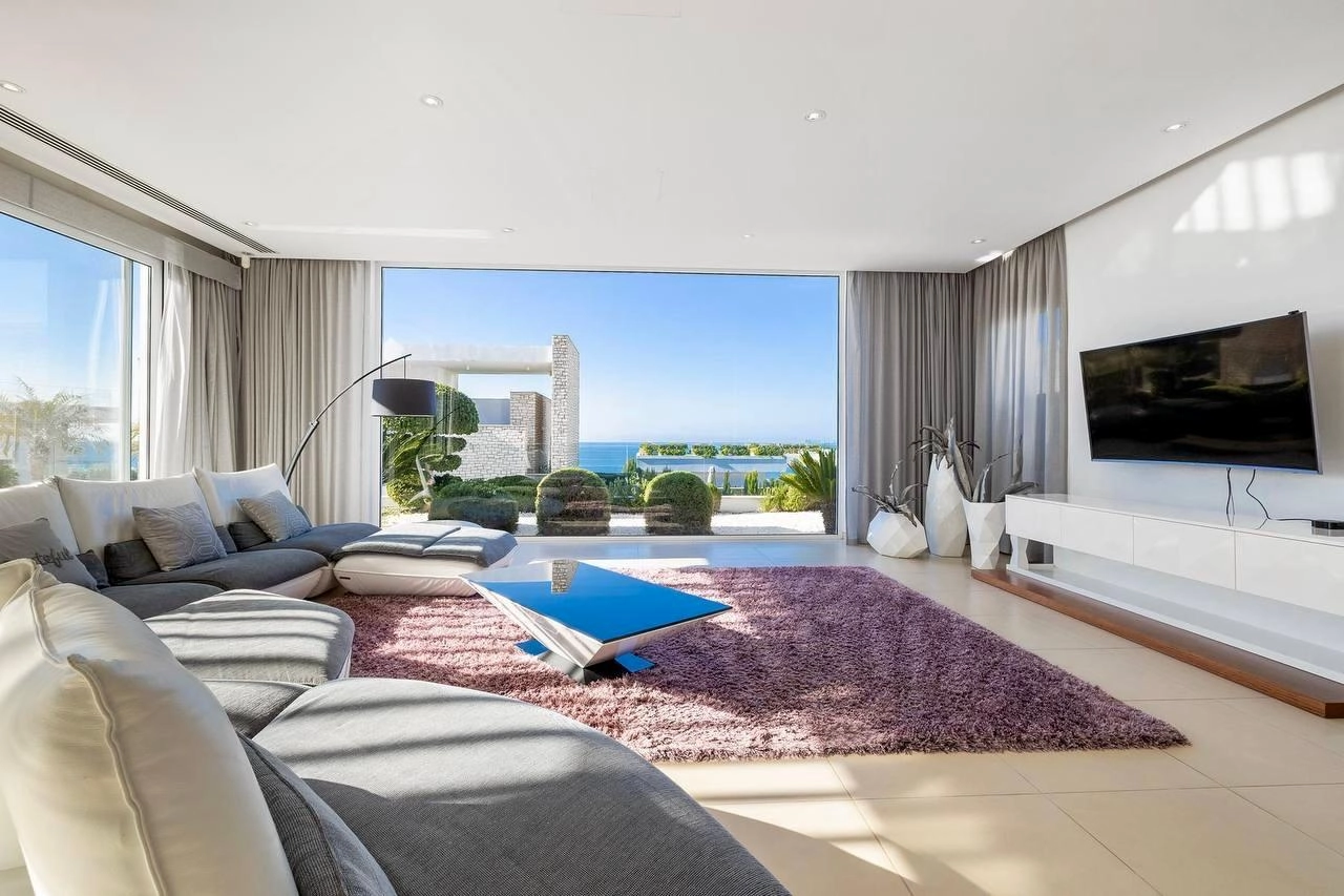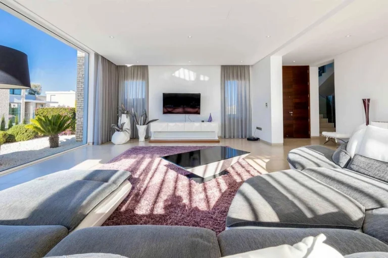 This luxurious 4 bedroom villa, located on the west coast of Cyprus, is part of the island’s most prestigious coastal cottage village. Every evening, sunsets of extraordinary beauty spread in this part of Cyprus, and the residents of the resort can enjoy them as much as possible. In addition, there are picturesque sea caves, and the sea water here is one of the cleanest on the island. Property owners have the right to use the entire exclusive infrastructure of the resort, including the services of a five-star hotel, hiring a chef or a babysitter, a chauffeur or a personal concierge. The resort’s infrastructure also includes a spa center, gym, restaurants, playground, football and basketball fields, 24-hour security, bicycle rental and much more. The villa is located on three levels: a spacious living room, flooded with sunshine, an equally large modern kitchen and dining room, as well as one of the bedrooms are on the ground level. The other three bedrooms are located on the top floor, and they all have stunning views, tasteful branded furniture and huge bathrooms. All living areas of the villa have huge floor-to-ceiling windows, a hidden VRV air conditioning system, spot lighting and underfloor heating. The 770 m2 plot has an artfully planted garden and an outdoor private pool with a shaded seating area where you can cool off on a hot summer day.