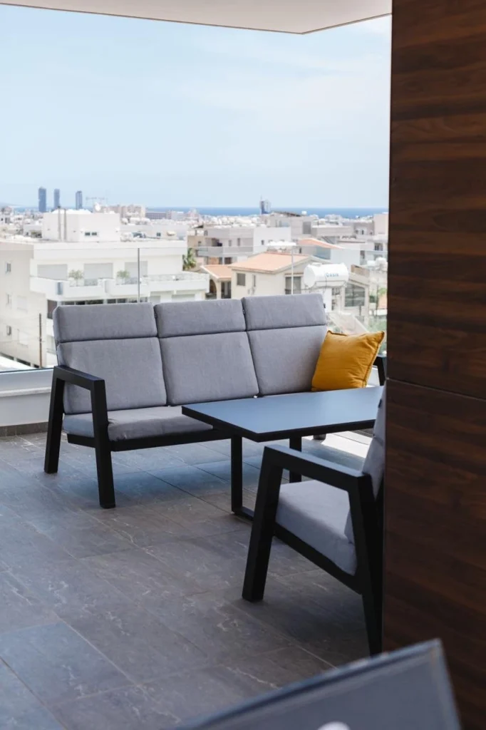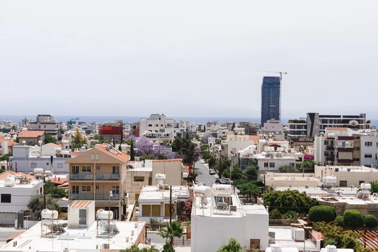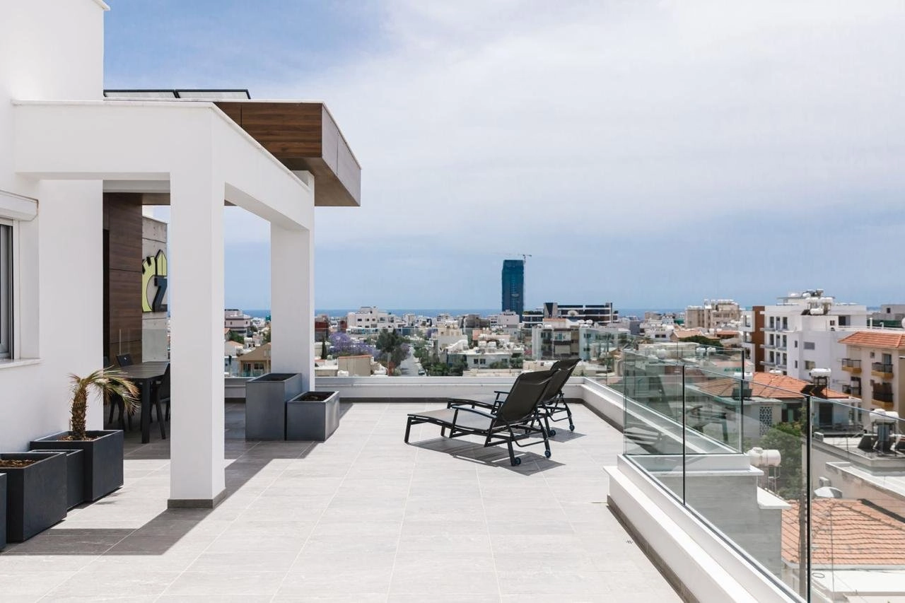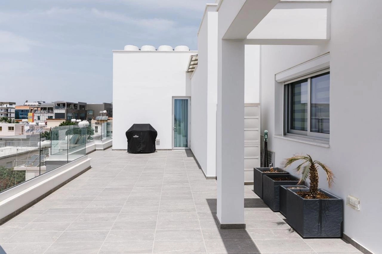 A majestic fully furnished three-bedroom penthouse with stunning panoramic views of the sea, the town and the mountains located in an oasis of calm on a quiet treelined street within the bustling urban neighbourhood of Mesa Geitonia. 2km to the sea, 150m to public transport and 100m to shops and school.