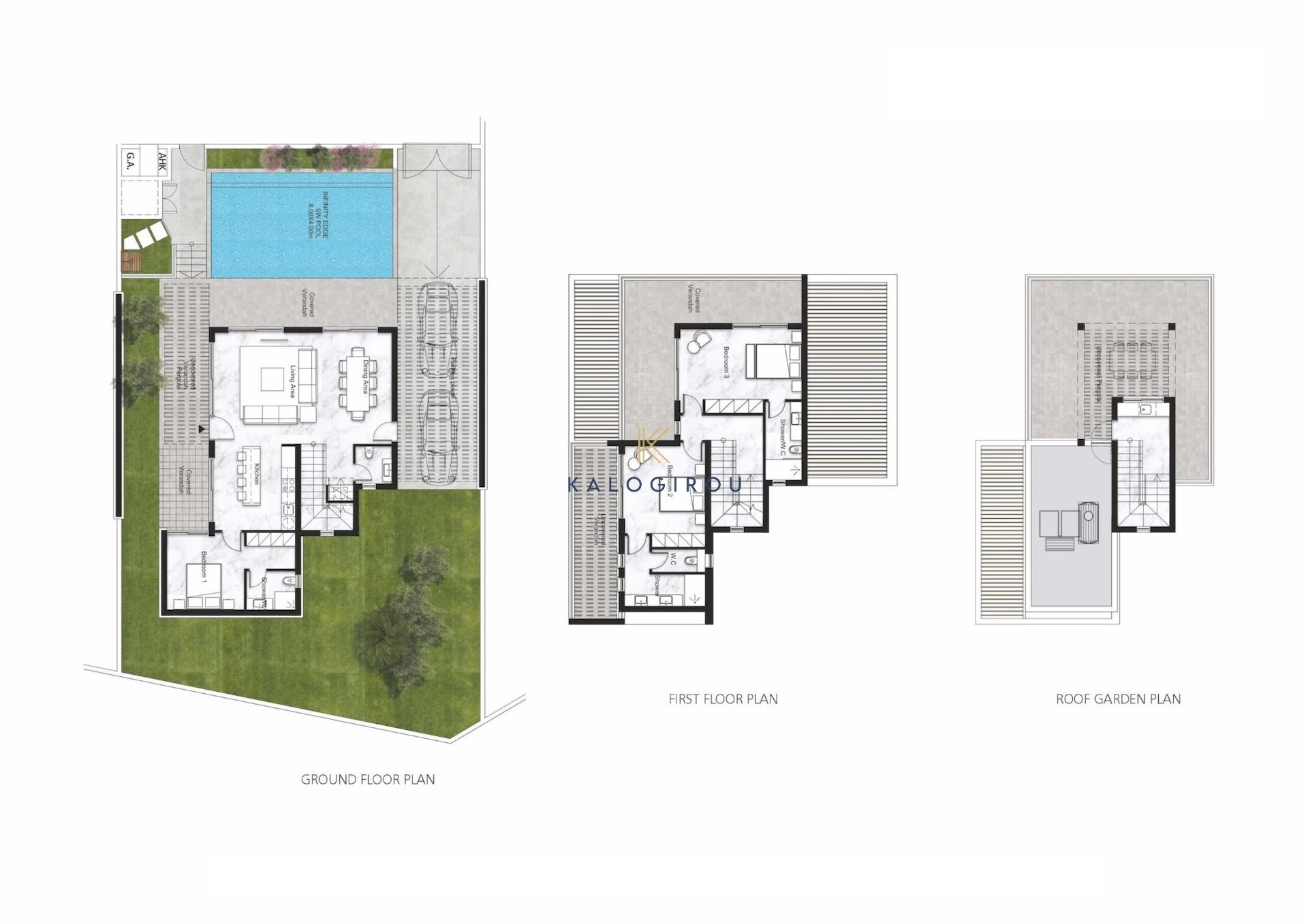 Double storey villa for sale in Chlorakas area. The ground floor consists of a living room, dining, kitchen with island in an open plan space, a guest toilet and one bedroom en suite with shower. The first floor consists of 2 en suite bedrooms and uncovered veranda. On the terrace there is a big roof garden. Externally, the house offers garden, infinity edge swimming pool and double parking space. Plot size is 400 sqm.