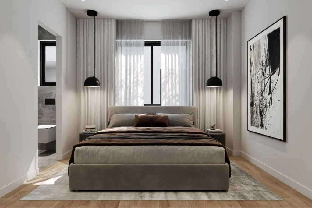 The apartment welcomes you with a bright open-plan layout, enhanced by high ceilings and large windows that flood the space with natural light. The spacious living room provides a relaxing setting with modern, comfortable furnishings and connects seamlessly to the dining area—perfect for entertaining or quiet evenings at home.
