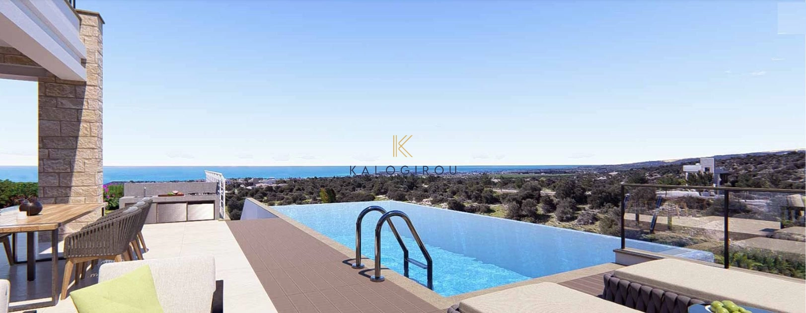 The property is located in a golf resort. The design of the villa has been inspired by a perfect fusion of contemporary and Mediterranean architecture using traditional materials such as stone, clay roof tiles, and wood in clean lines and large open spaces. The villa is designed on a large plot and enjoys a private swimming pool, spacious interiors and large terraces while having beautiful sea views of the Mediterranean.