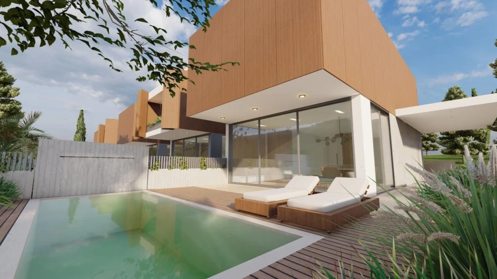 Villa for sale in a new residential complex located in the area of Kissonerga, Paphos. A modern villa with a private pool, located near the sea, designed in a modern architectural style, offering comfortable accommodation. A great option for both permanent residence and investment.