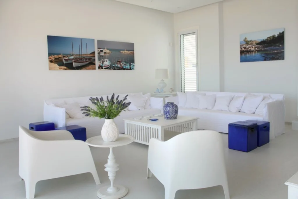 Reference ID: #SA33647Price details: €1,550,000A unique and modern seafront property, designed, furnished and equipped with top-notch luxury and the ad most care to detail. The minimal and modern design, the colors and style of the Greek island house and the breathtaking views of the crystal-clear blue waters of the Mediterranean are the characteristics of this beautiful house.The ground floor features a large living room and an open plan kitchen with a breakfast bar and dining table. The large balcony doors open wide to the pool terrace to join the outside with the indoor areas into a large living space that enjoys unobstructed sea views from every corner.The ground floor also offers a double bedroom and a guest WC and shower. At the lower floor there is twin bedroom with en-suite shower and a mini kitchenette as well as a games room that features a large flat screen TV, gaming console and a double sofa bed.On the first floor there is a further three bedrooms. One double and one twin both en-suite and the very spacious master bedroom with a unique designer bathroom with full glass window looking past the bedroom onto the seafront.No VAT