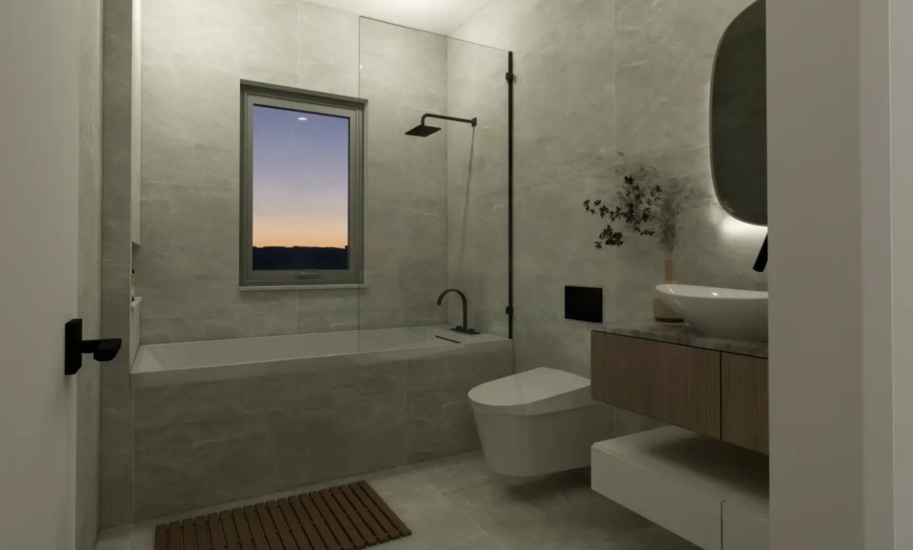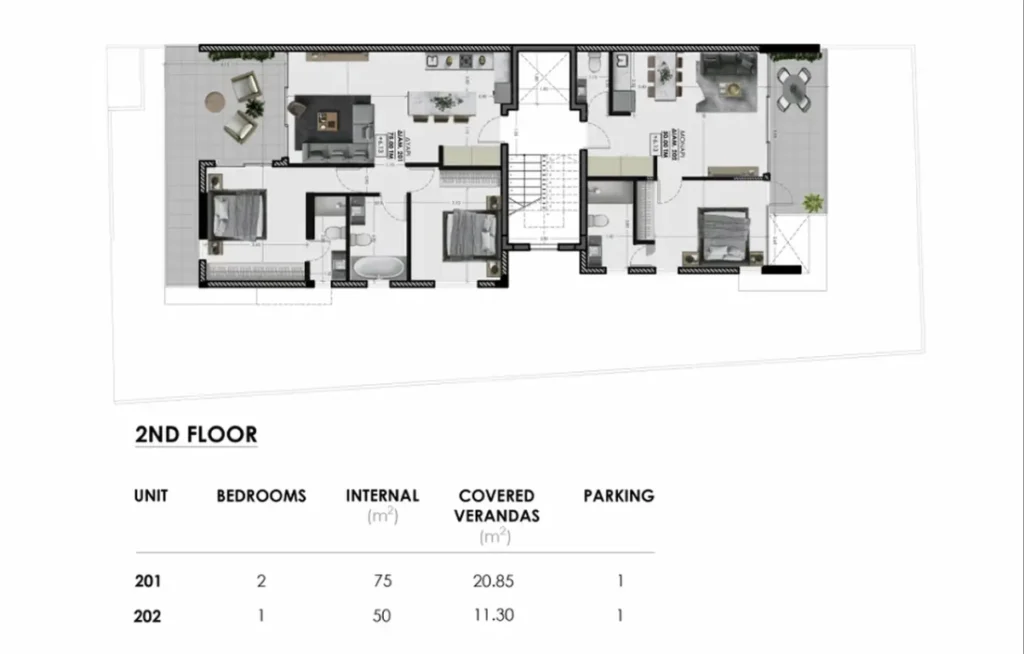 Both bedrooms are well-proportioned, with large windows allowing plenty of natural light. The master bedroom includes built-in wardrobes and shares access to a sleek, modern bathroom.