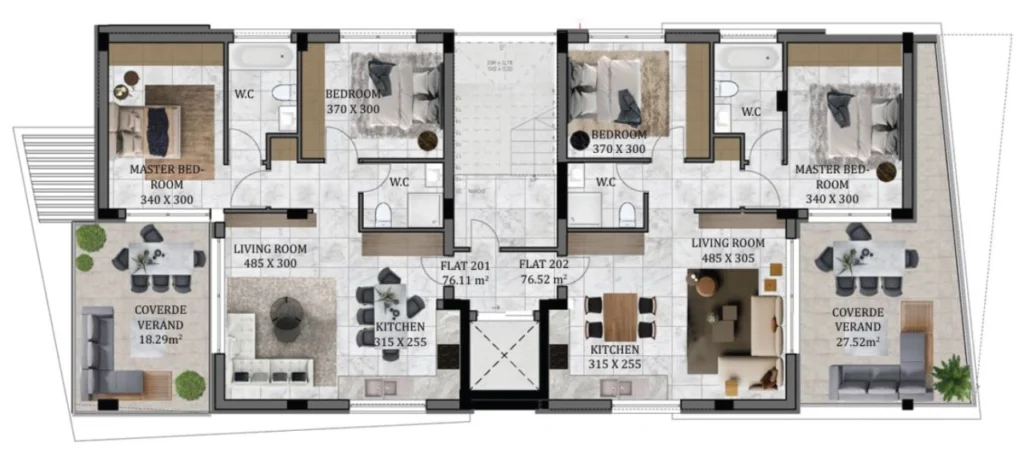 Each apartment boasts a smart layout, generous balconies, and high-quality finishes, with provisions for air conditioning and underfloor heating to ensure year-round comfort.