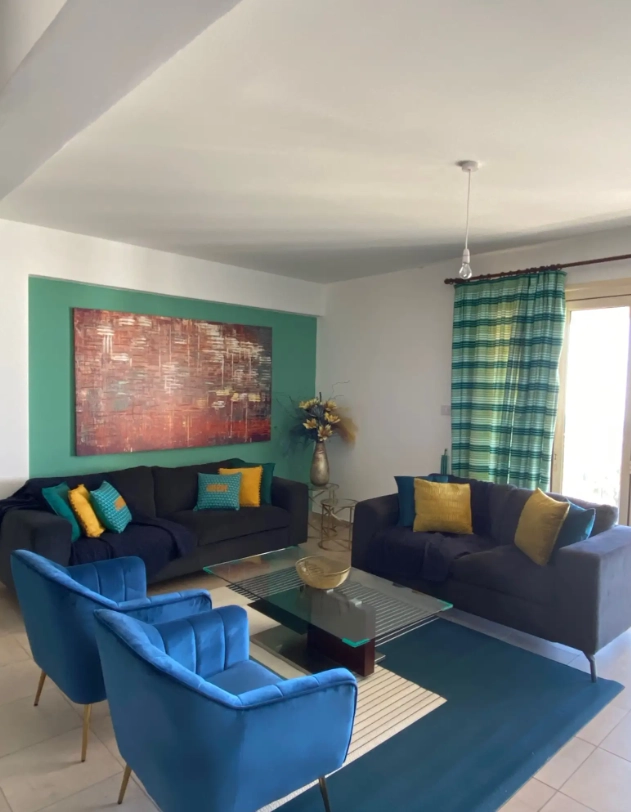 The fully furnished house is located on the 1st floor ,has 3 bedrooms with fitted wardrobes , 3 bathrooms , a large kitchen complete with all major equipment , an open plan dinning/ living area with patio doors leading to a large balcony. Moreover there is uncovered parking and a garden with various trees.