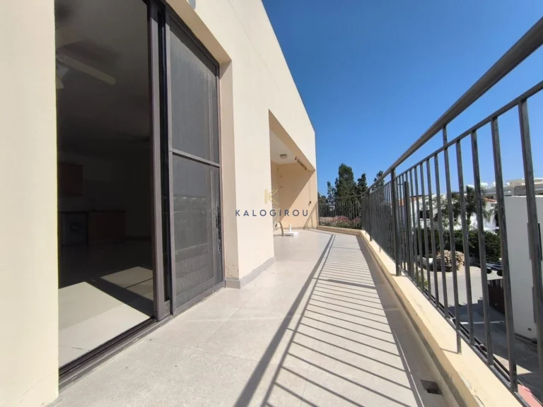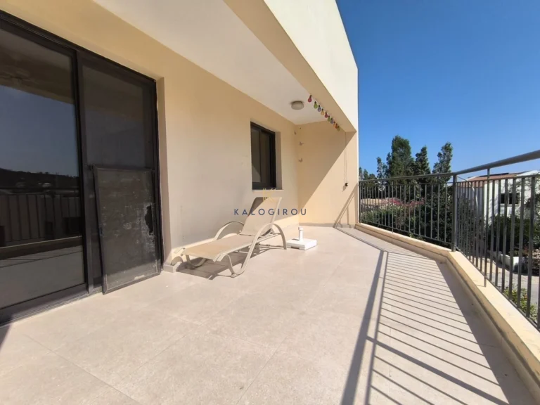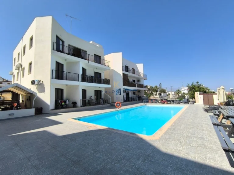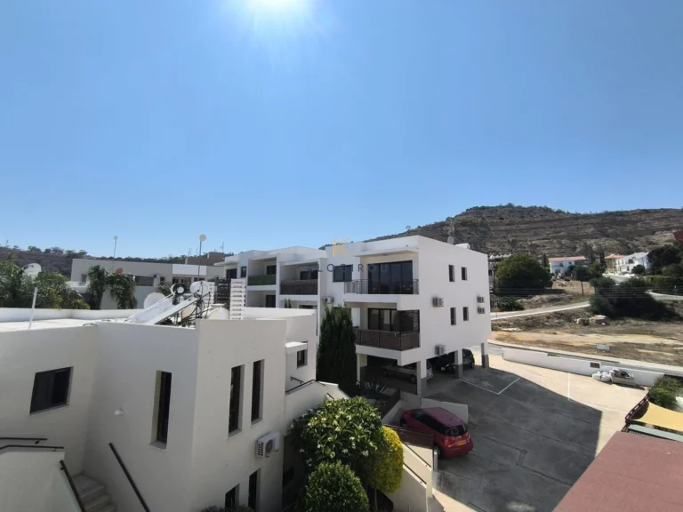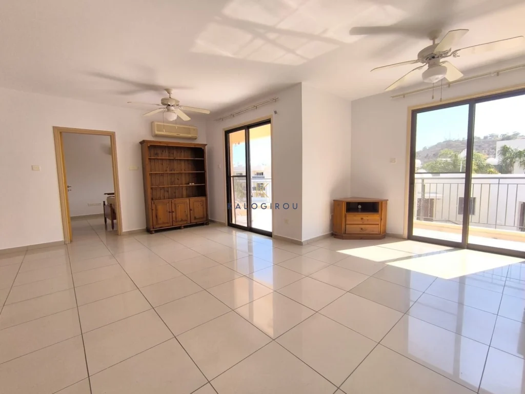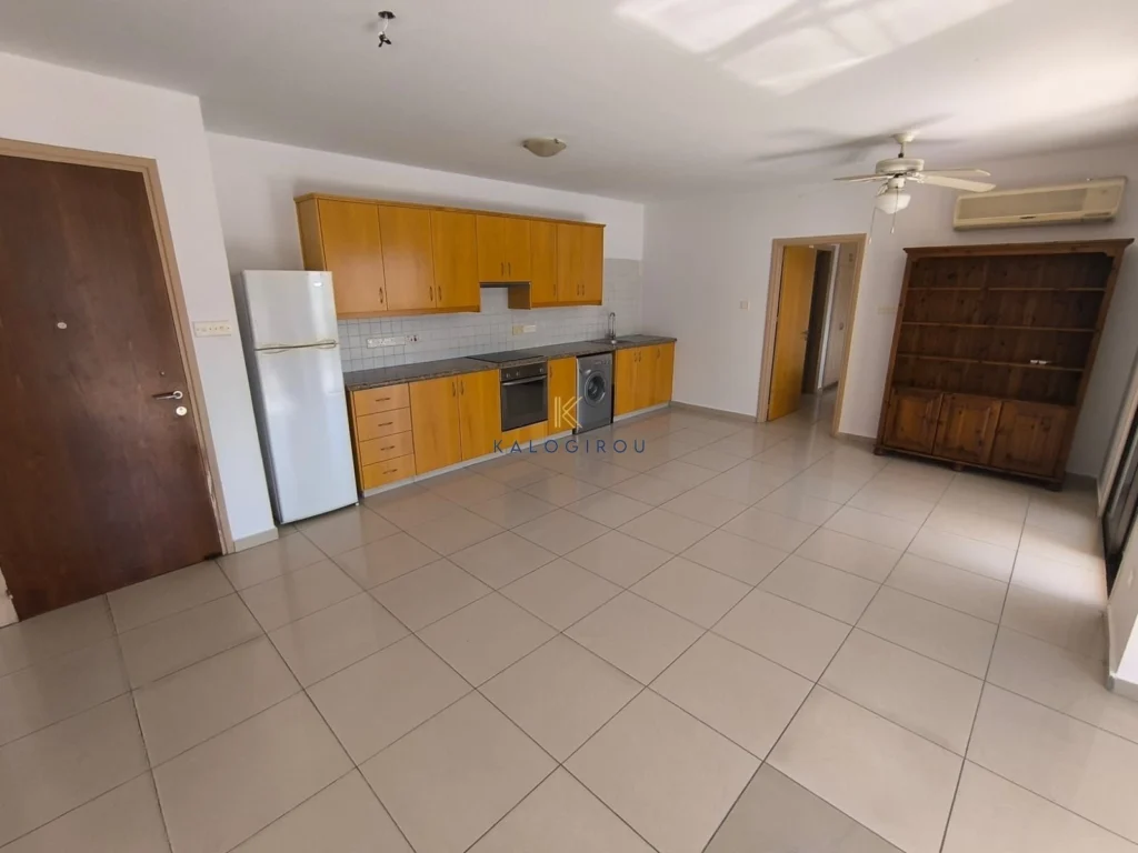 Apartment for sale in Oroklini, Larnaca. The apartment features an open-plan living and kitchen area, two bedrooms, one en suite shower with wc and one bathroom with WC covered and uncovered veranda. Additionally, the apartment is situated in a complex with communal swimming pool.