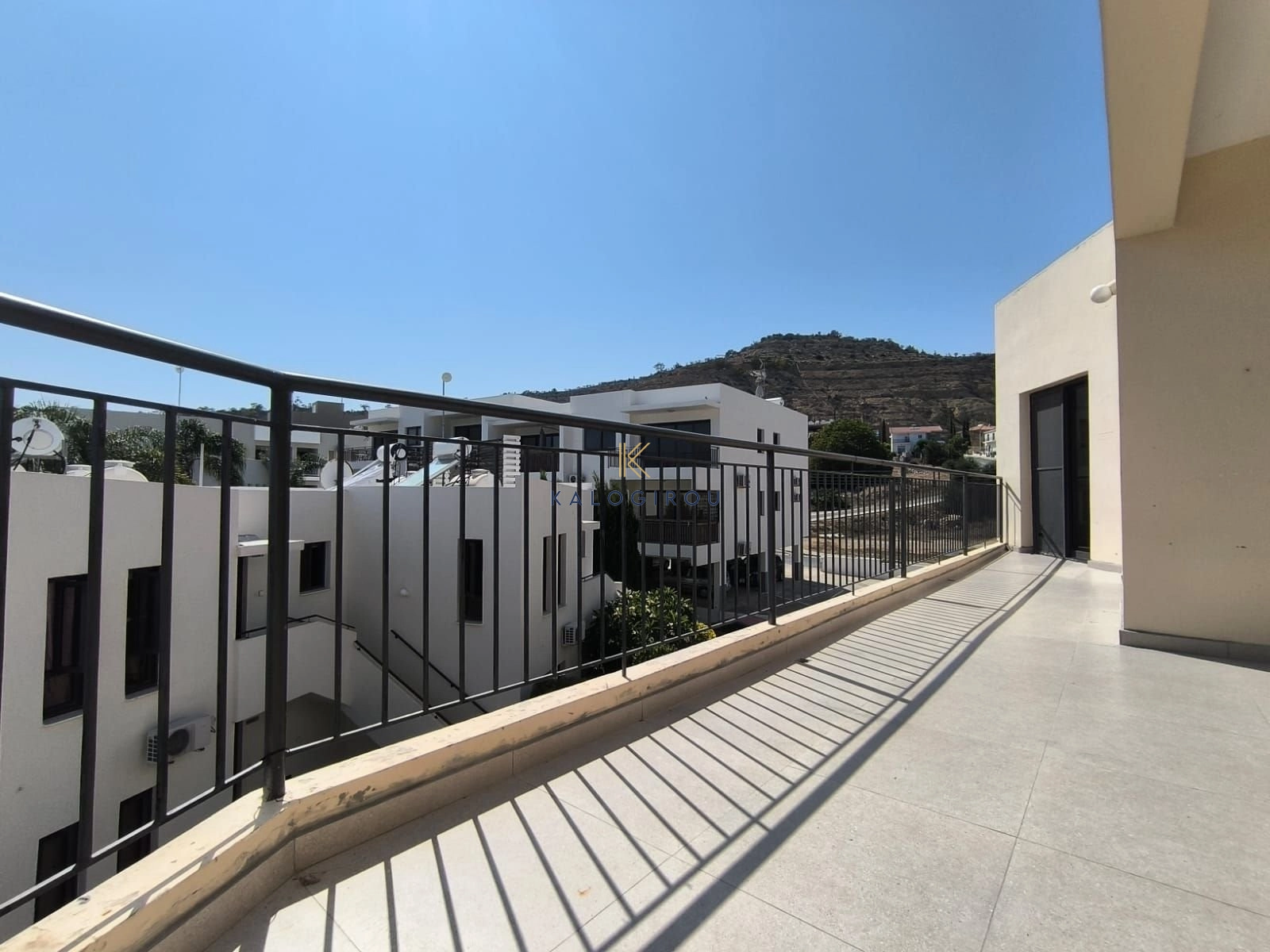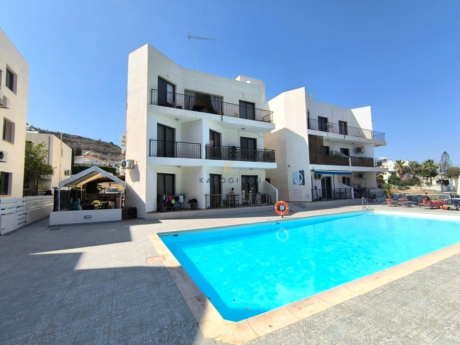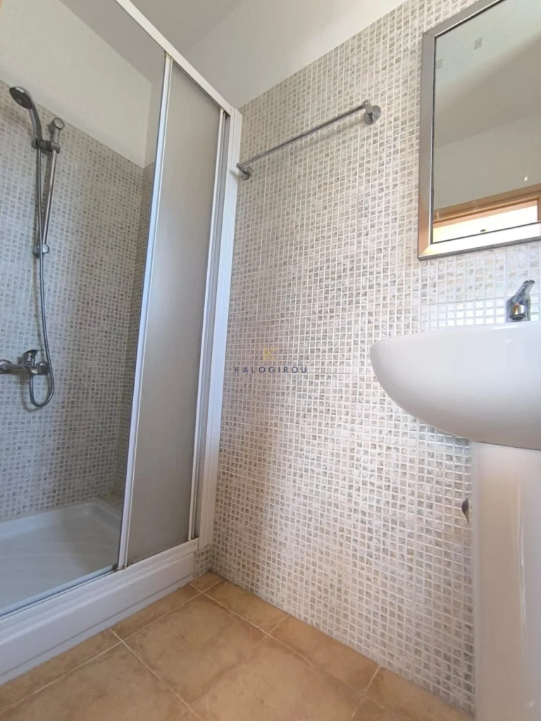 Apartment for sale in Oroklini, Larnaca. The apartment features an open-plan living and kitchen area, two bedrooms, one en suite shower with wc and one bathroom with WC covered and uncovered veranda. Additionally, the apartment is situated in a complex with communal swimming pool.