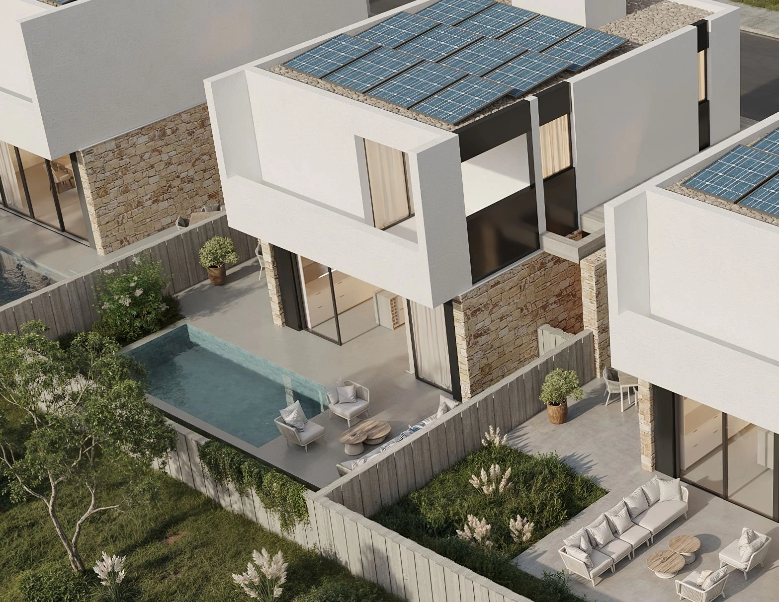 Each home features sleek open-plan living beneath 3.10 m high ceilings, with floor-to-ceiling glass doors flooding interiors with light. Premium amenities include underfloor heating zoned per floor, a VRV cooling system, full thermal insulation, and a photovoltaic system everything is included in the price. Optional private pools, expand outdoor living, while security systems, a water filtration setup, and walk-in showers elevate daily convenience. Outside, two-car parking with electric gates and a built-in BBQ area complete the picture.