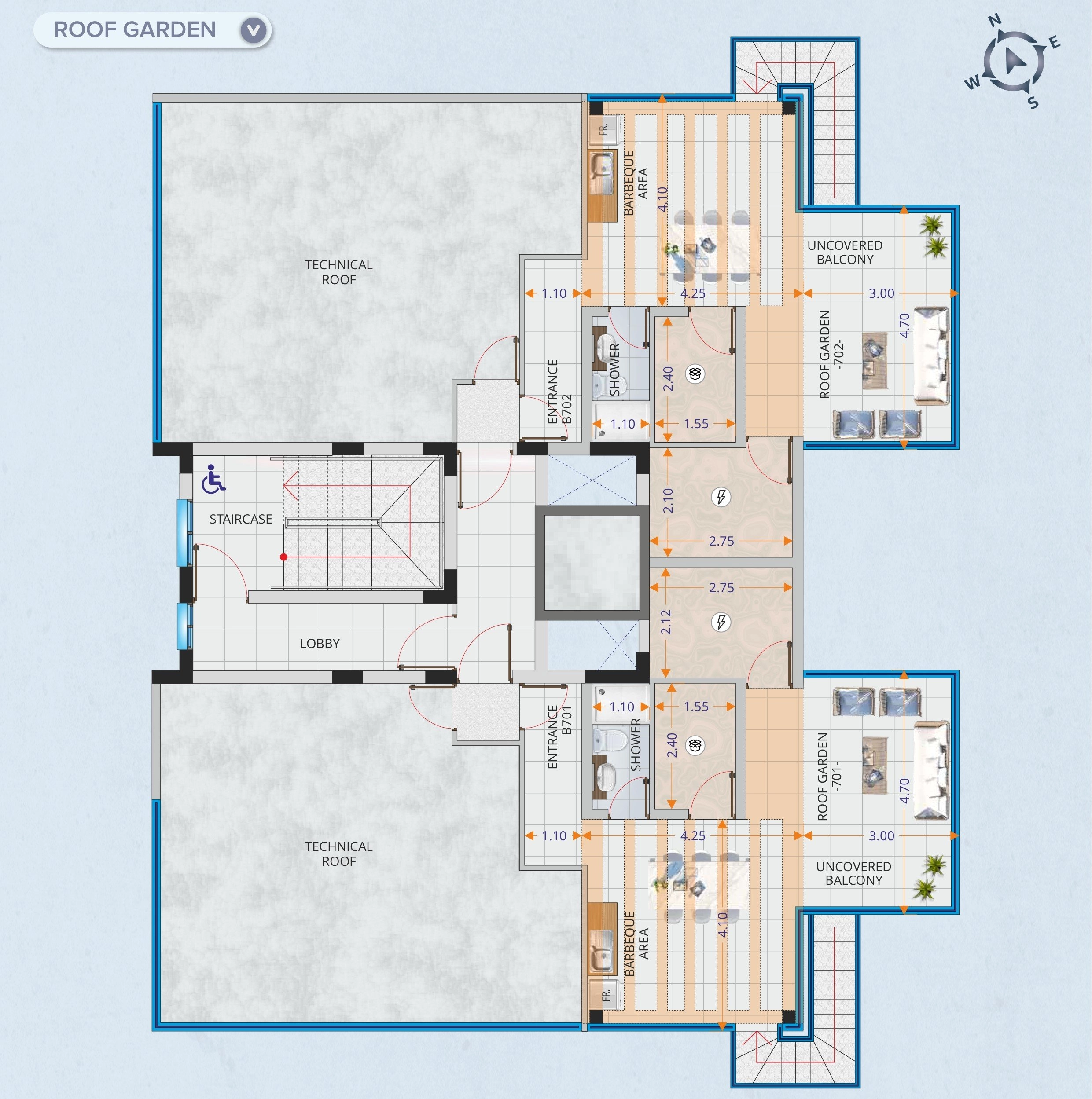 Positioned on the top floor of a stylish residential building, the penthouse features a spacious open-plan layout, premium Italian ceramic finishes, and expansive glass balconies. It is further enhanced by a private roof garden, perfect for relaxing or entertaining while enjoying stunning views of the surrounding upscale neighborhood.