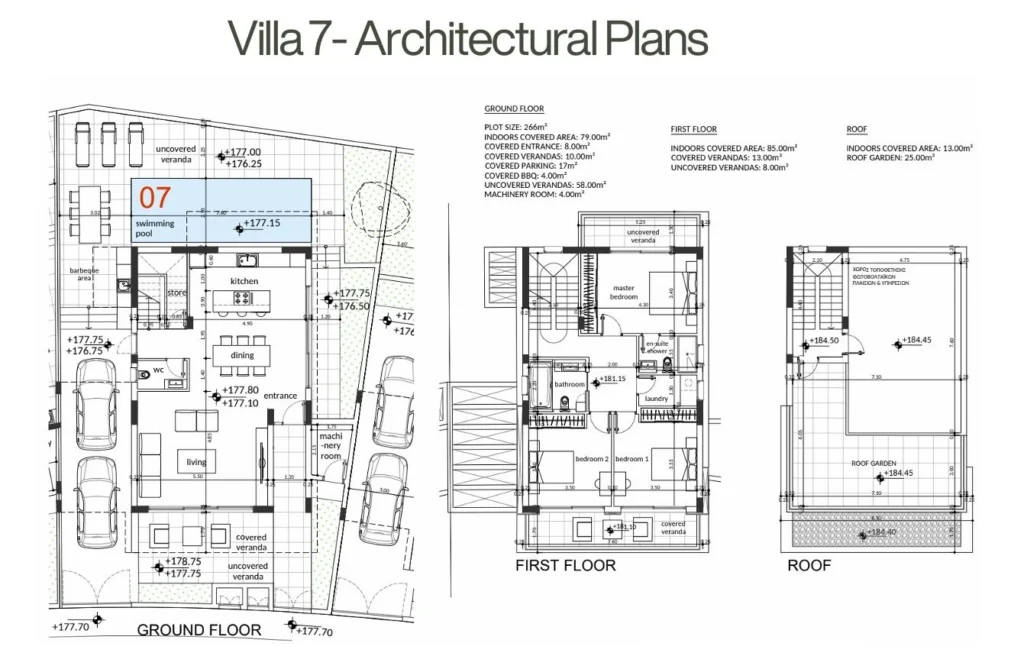 A three-bedroom, two-storey villa №7B with a private swimming pool, offering an internal area of 164 m², is situated on a 266 m² plot.