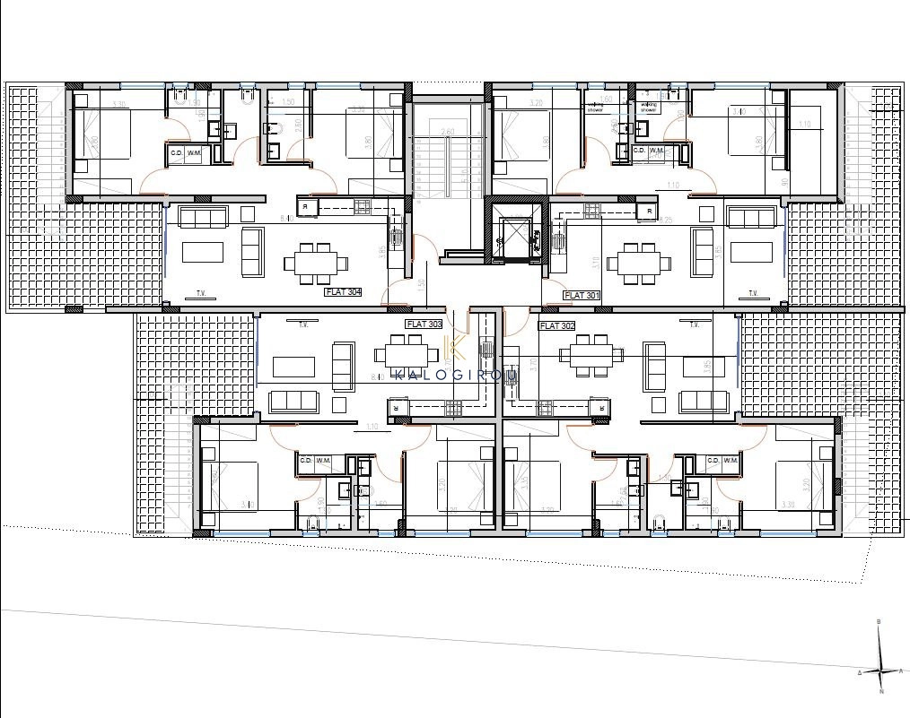 Apartment for sale in Larnaca, Mc Donald Drive Thru area. The apartment consists of an open plan kitchen, dining, living area, two bedrooms, master bedroom en suite (shower), a main shower room, laundry station and covered veranda. Additionally, the apartment has right of use to a covered parking and storage room.
