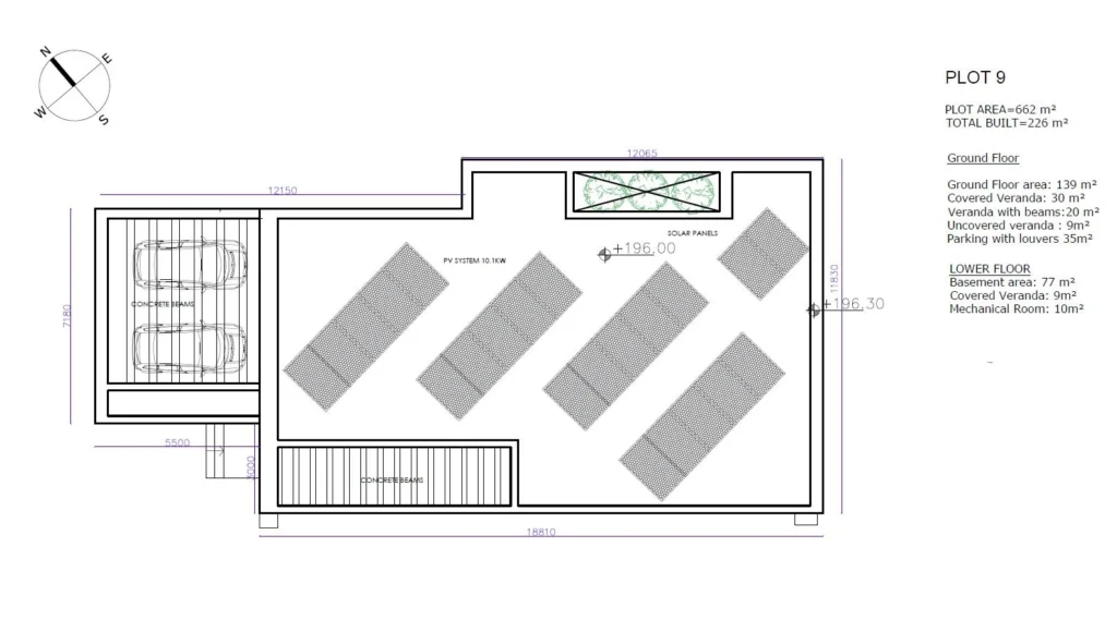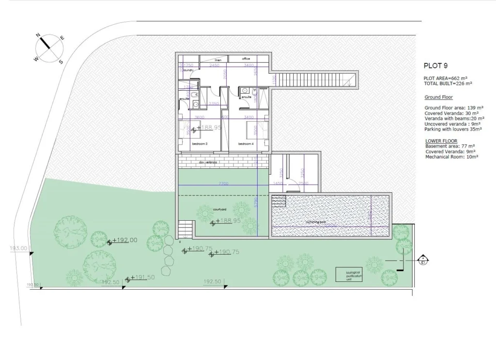 A four-bedroom, two-storey villa №9 with a private swimming pool, offering an internal area of 216 m², is situated on a 662 m² plot.