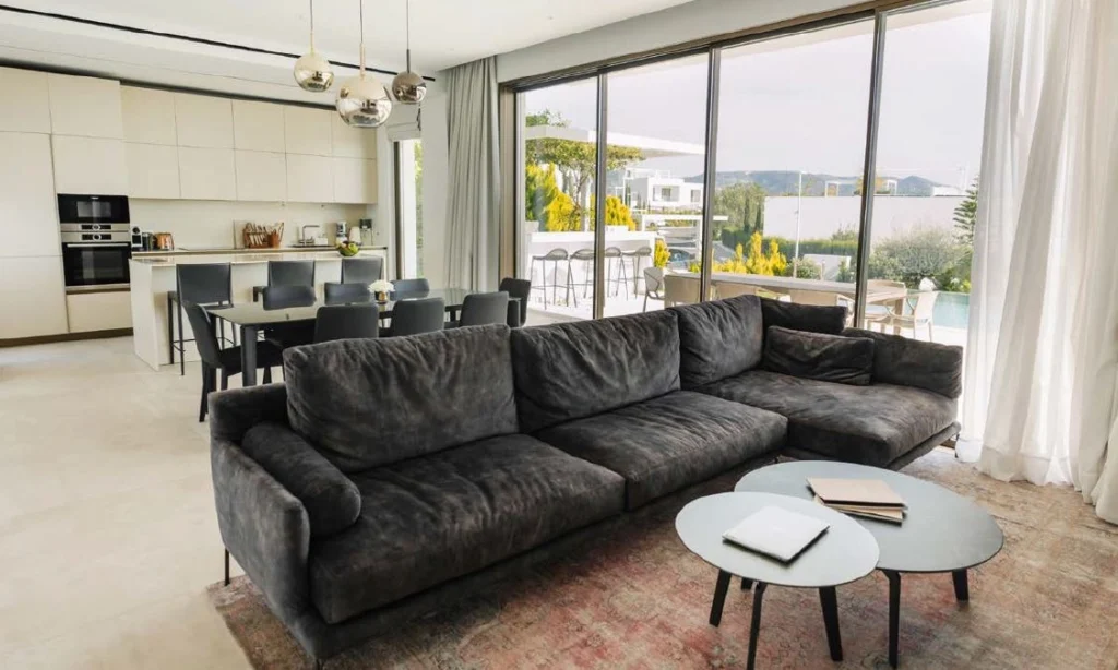 It features heated floors, a barbecue area, and a beautiful garden. The villa offers high-class finishes and stunning sea views for a comfortable stay.