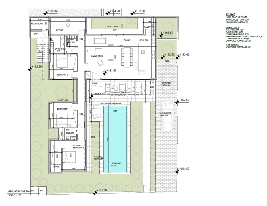 A three-bedroom, one-storey villa with a private swimming pool, offering an internal area of 199 m², is situated on a 607 m² plot.