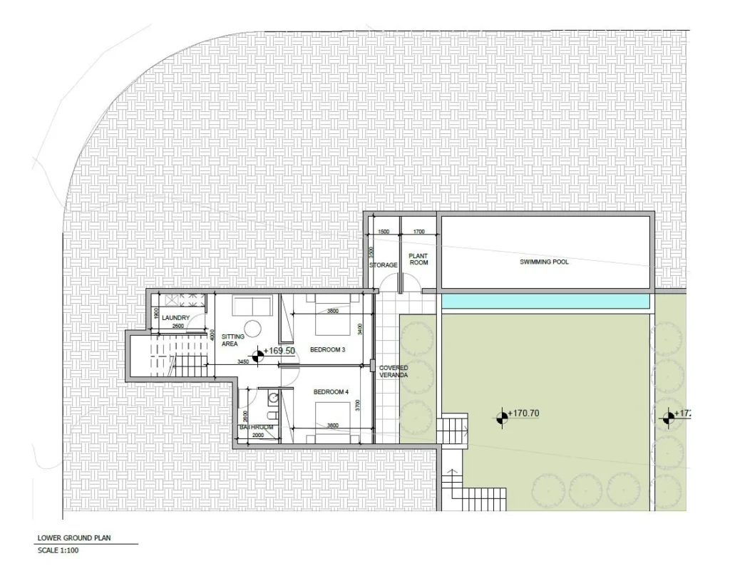 A four-bedroom, one-storey villa with a private swimming pool, offering an internal area of 213 m², is situated on a 641 m² plot.