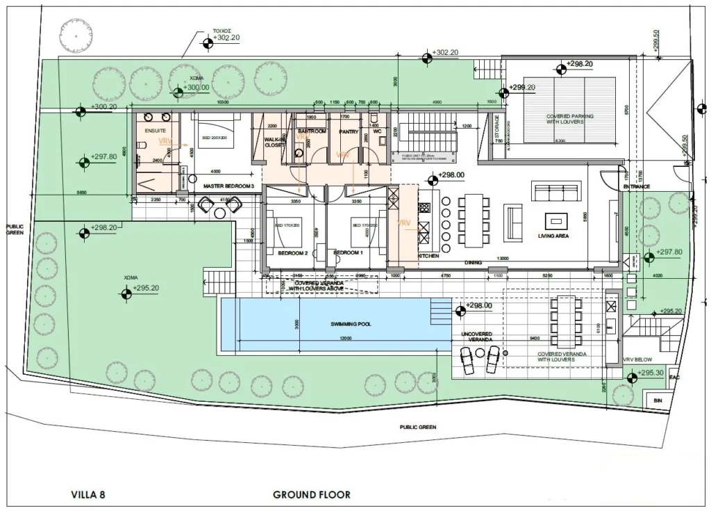 Our project specification and pricing package includes a 10.1 kW photovoltaic system with high-output solar panels for renewable energy autonomy, electric curtain provisions in every room for effortless ambience control, and private parking with an electric gate and EV charger for two vehicles. Advanced security integrates an alarm, high-resolution cameras and a reinforced entrance lock. Comfort comes from underfloor heating powered by a heat pump and a concealed VRV cooling system, complemented by lofty ceilings and tall doors. The open-plan living, dining and kitchen area flows to an outdoor kitchen and barbecue space, with dedicated laundry, storage and plant rooms. All residences achieve Energy Efficiency Category A+.