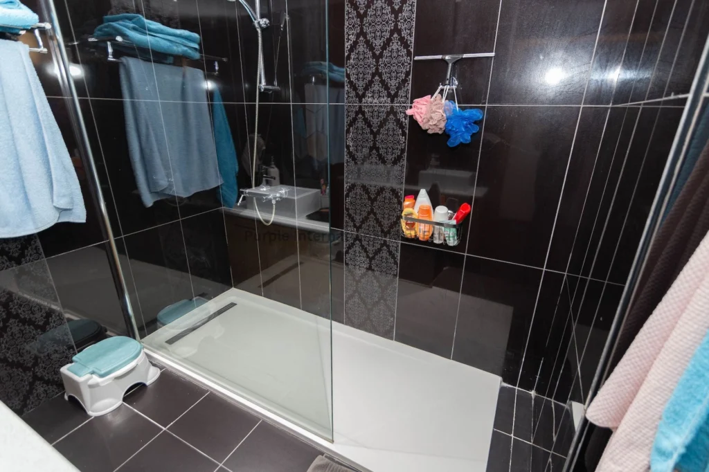 Upon entering, you are greeted by a generously sized family lounge area that opens onto a veranda offering views of the neighborhood. Moving through the hallway, you’ll find convenient storage space, two guest toilets and a modern family shower room. The third bedroom is currently utilized as a beauty room, while the second and third bedrooms are located further down the hallway. At the far end lies the modern fitted kitchen dining area, providing access to a second veranda with ample space for outdoor dining.