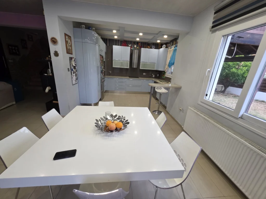 A four-bedroom villa is for sale in the Pyla area of Larnaca, situated on a 350 m² plot, just 2400 meters from the sea. The total covered area is 180 m², with 160 m² of internal living space. Built in 2007, the house is fully ready for occupancy. It features three bathrooms, a storage room, a communal swimming pool, furniture, household appliances, air conditioning, parking, and has title deeds. The property has an energy efficiency rating of class B.