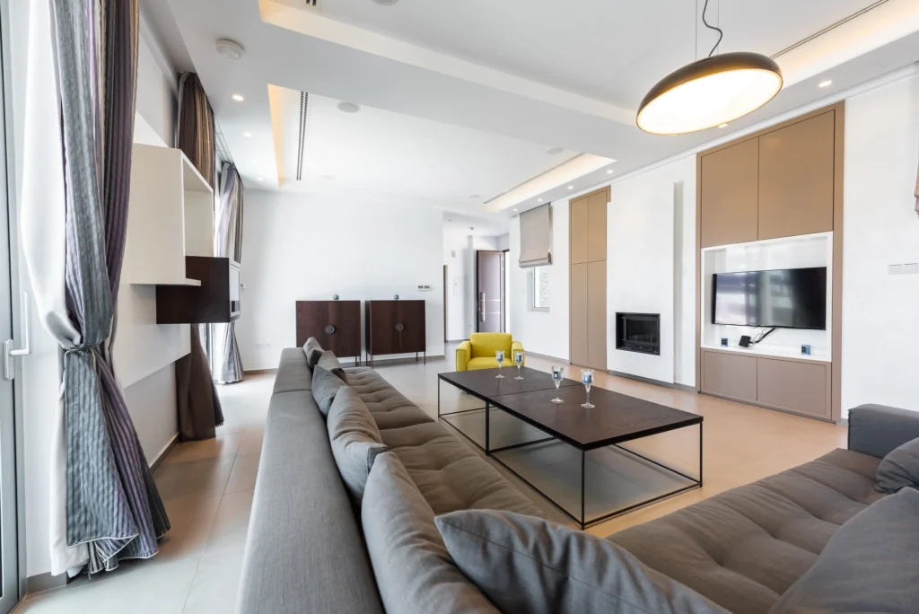 Impressive luxury villa of 300 m2 for sale in Agia Napa, Famagusta on a plot of 900 m2. The villa is located in a prestigious private residential area, providing the perfect combination of comfort, privacy and a high standard of living. On the ground floor there is a spacious living room, a large open—plan kitchen, a dining area and two cozy bedrooms – ideal for a family stay or a reception. There are three more bedrooms on the second level, providing enough space for a large family or guest accommodation. One of the main advantages of this villa is the roof garden, located on the third level, overlooking the sea — an ideal place for outdoor recreation and pleasant evenings in a calm atmosphere. The villa is fully furnished and equipped with underfloor heating, smart thermostat, air conditioning, professional household appliances and modern lighting throughout the house. The well-maintained green courtyard offers a barbecue area with dining tables, located next to the private pool, creating ideal conditions for enjoying the Mediterranean lifestyle.This villa is an excellent choice for both long—term stays and comfortable seasonal holidays in one of the most prestigious areas of Agia Napa, Famagusta.