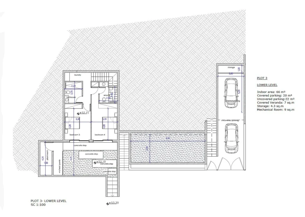 A four-bedroom, two-storey villa №3 with a private swimming pool, offering an internal area of 193 m², is situated on a 610 m² plot.
