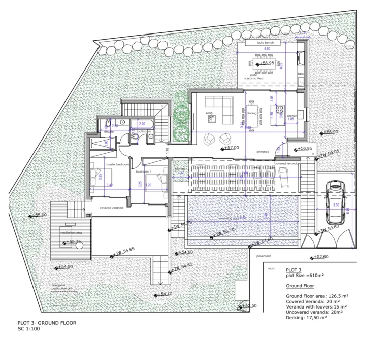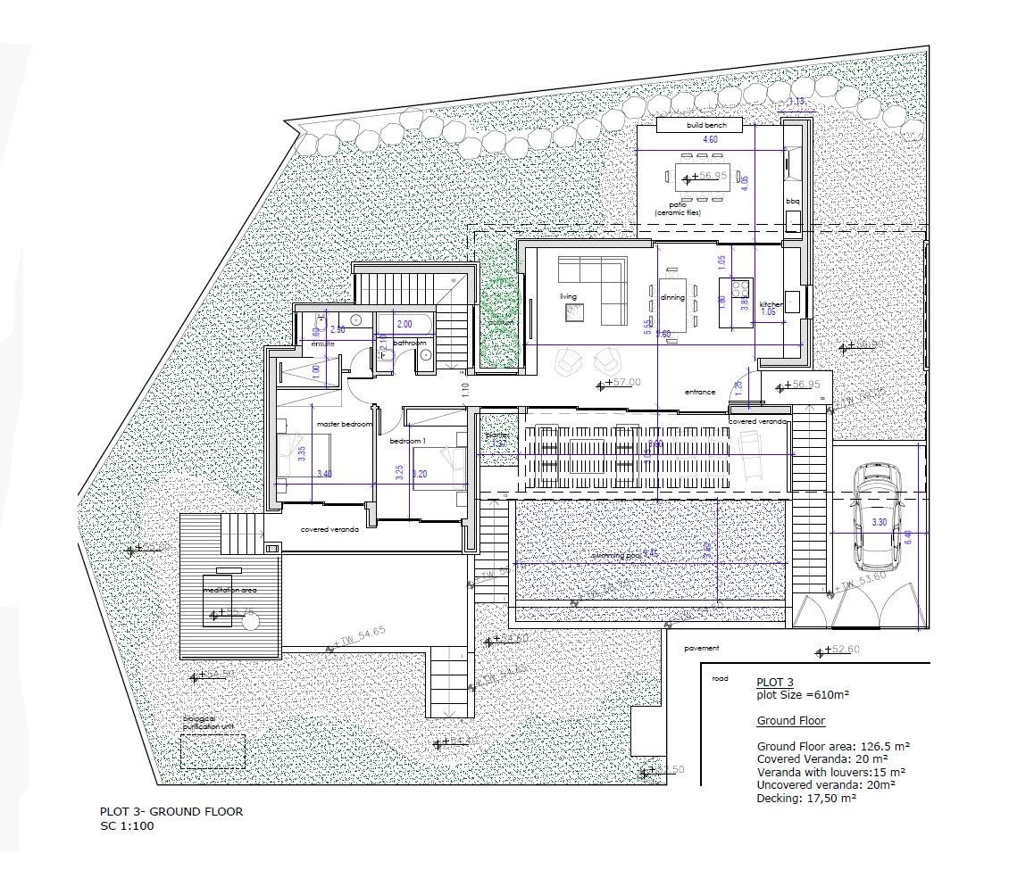 A four-bedroom, two-storey villa №3 with a private swimming pool, offering an internal area of 193 m², is situated on a 610 m² plot.
