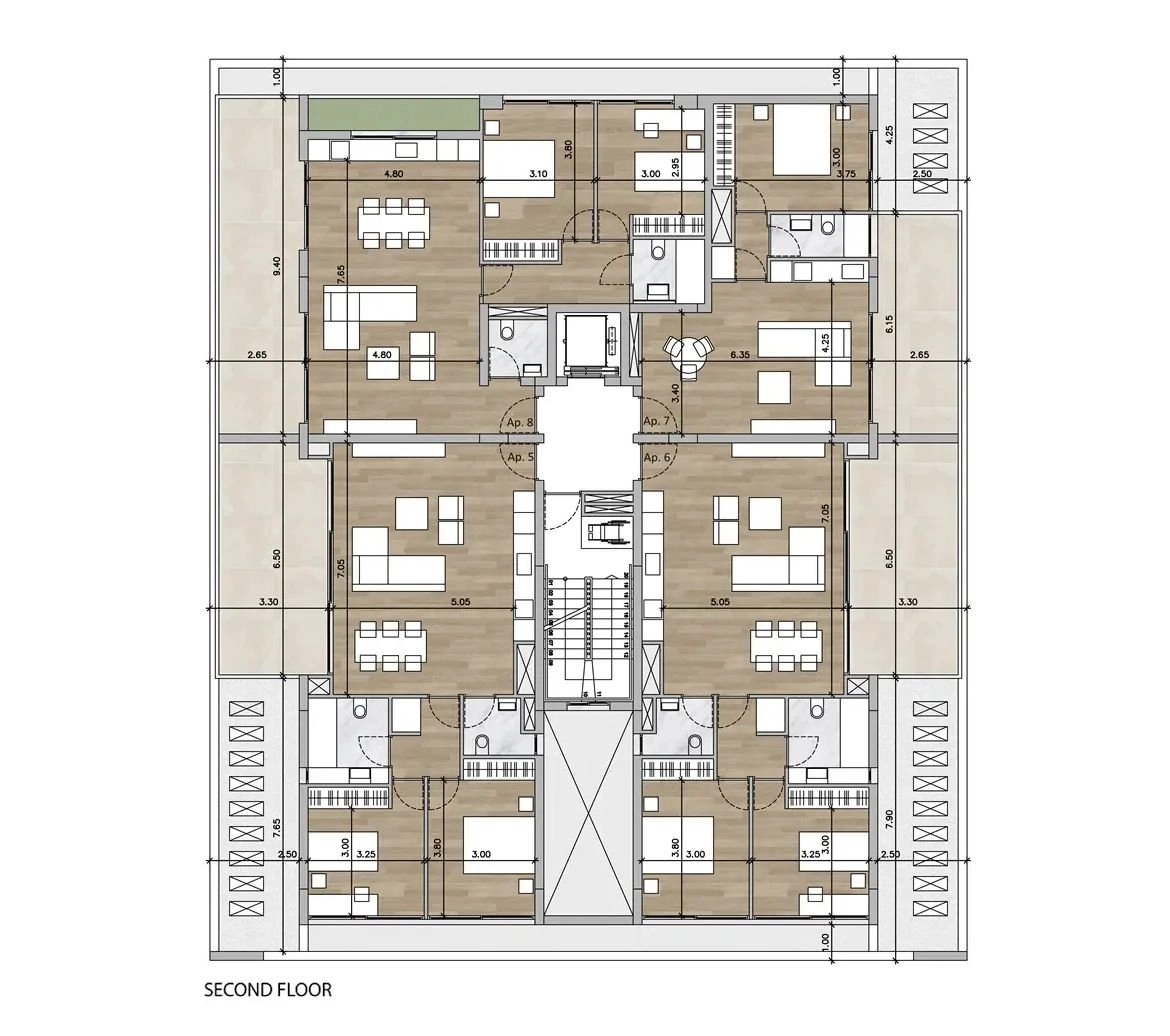 Two-bedroom apartment 08, with an internal area of 85 m², is located on the second floor of a four-storey building.