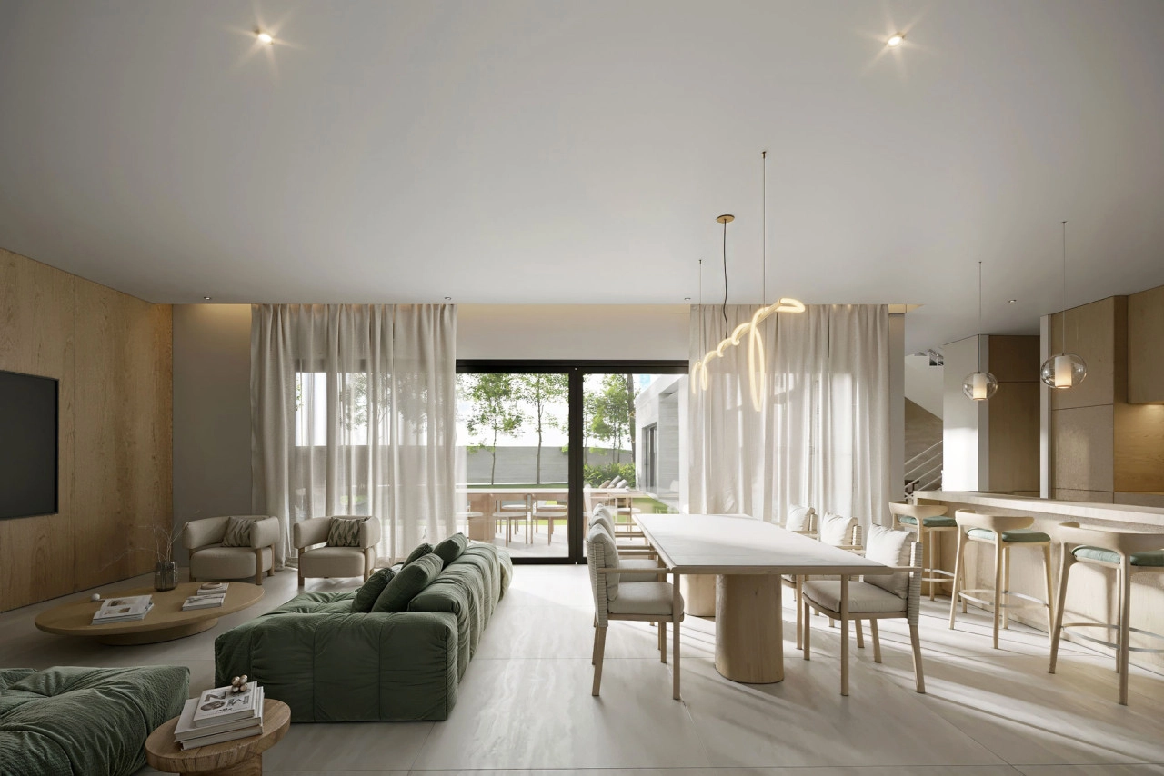 A contemporary-designed villa with a beautiful garden, a double-covered garage, large terraces, and an optional pool.