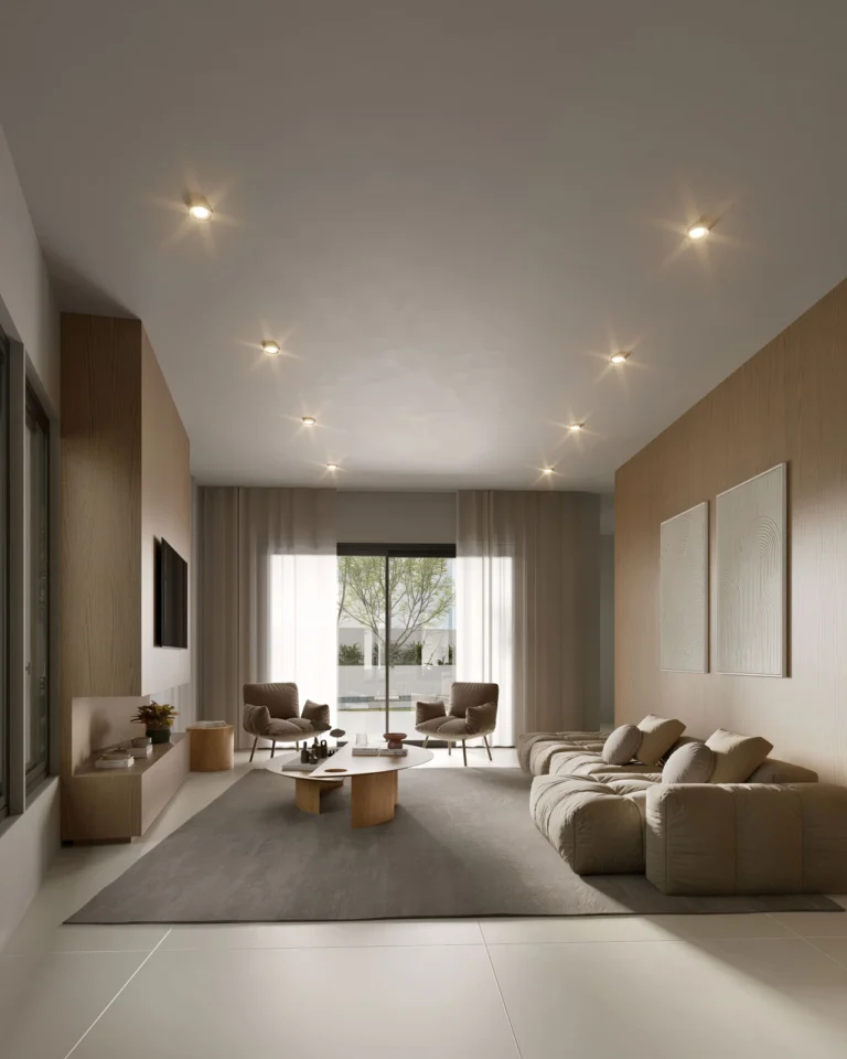 A contemporary-designed villa with a beautiful garden, a double-covered garage, large terraces, and an optional pool.