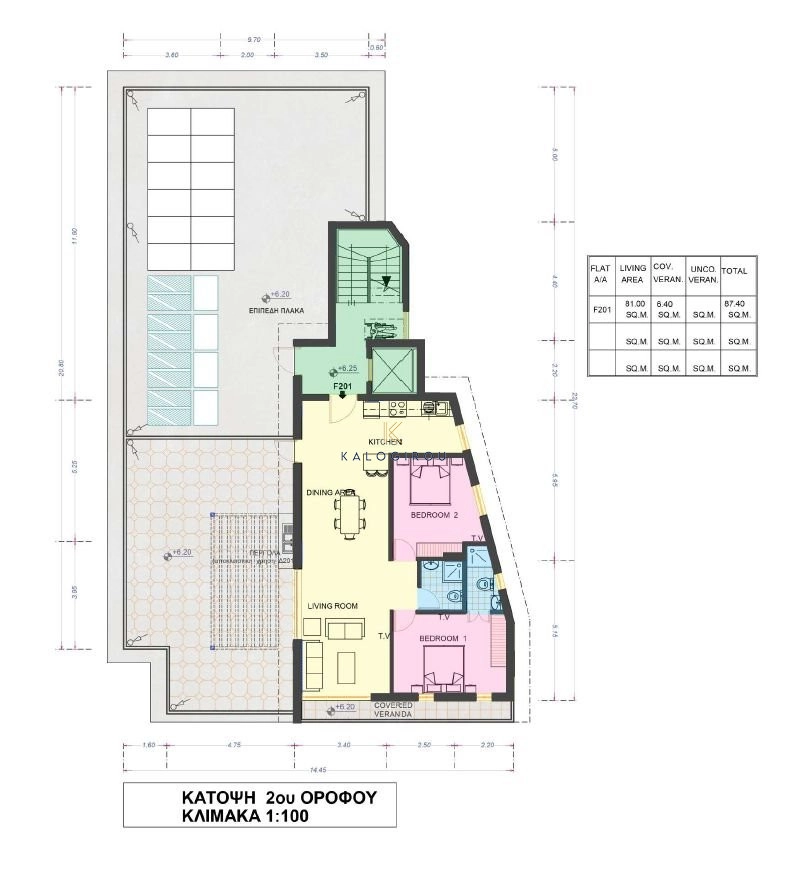 First floor apartment for sale in Kiti Area, Larnaca. It consists of an open plan kitchen, living & dining area, a main shower room, two bedrooms, master bedroom is en suite (shower) and covered veranda. The residents have also access to a private covered parking space on the ground level.