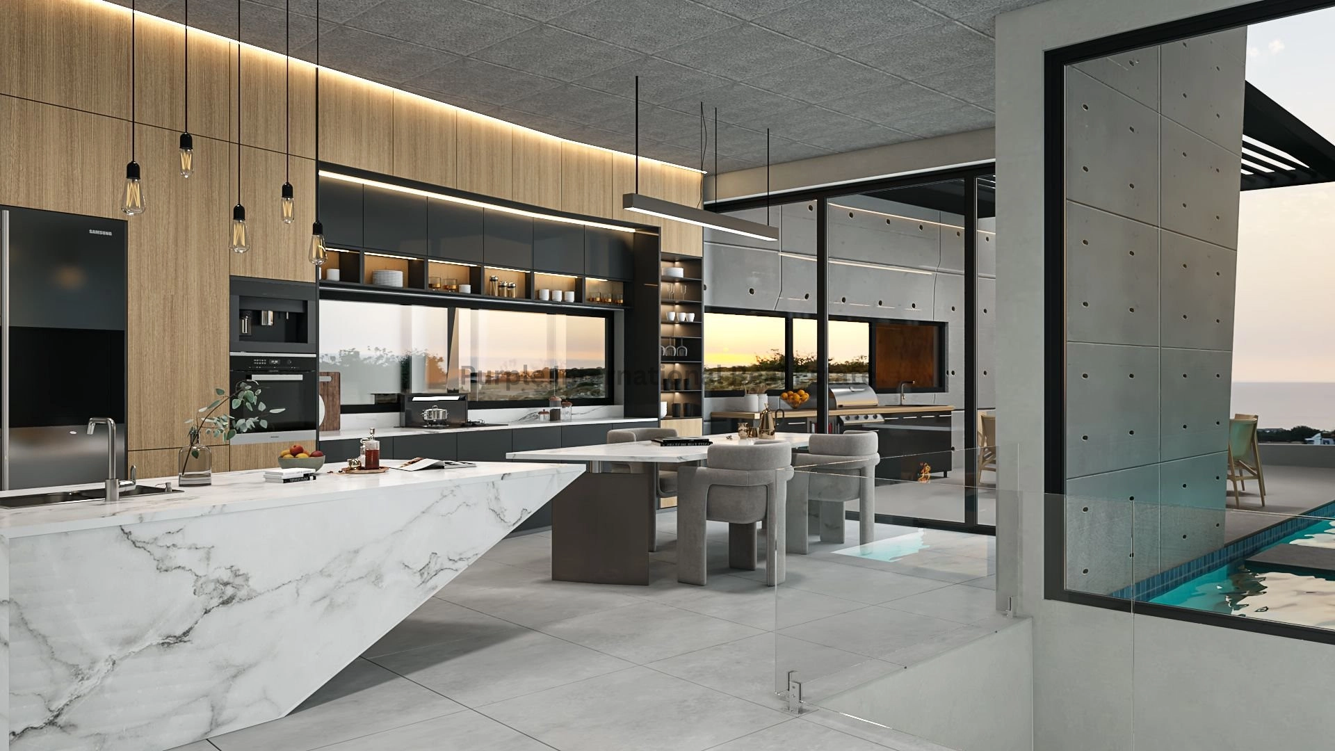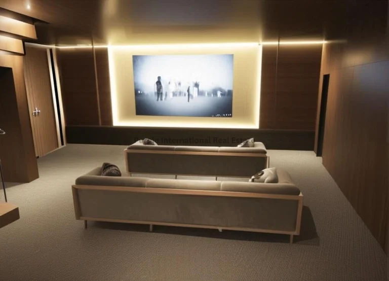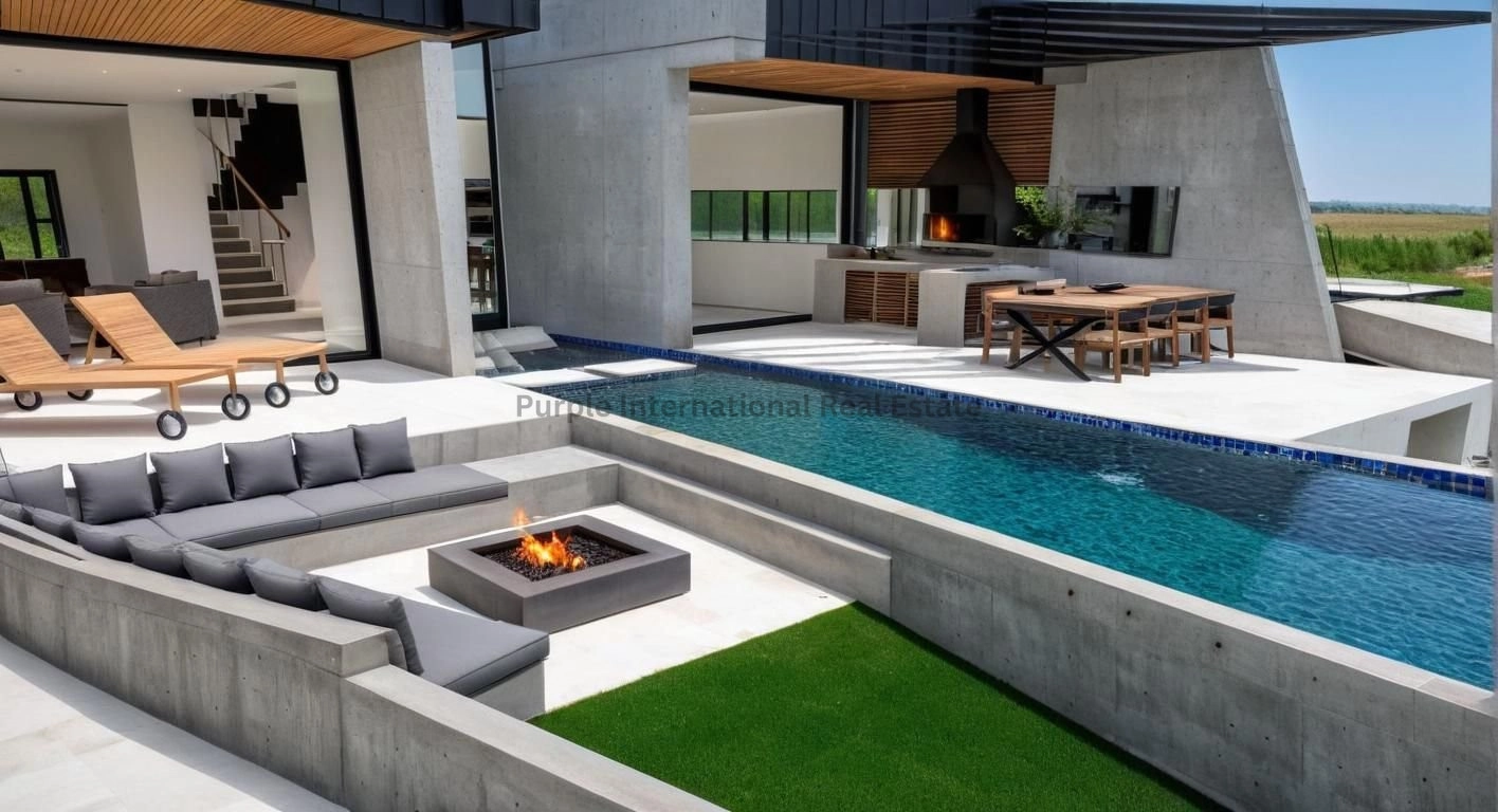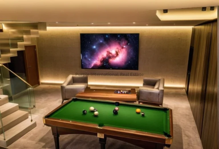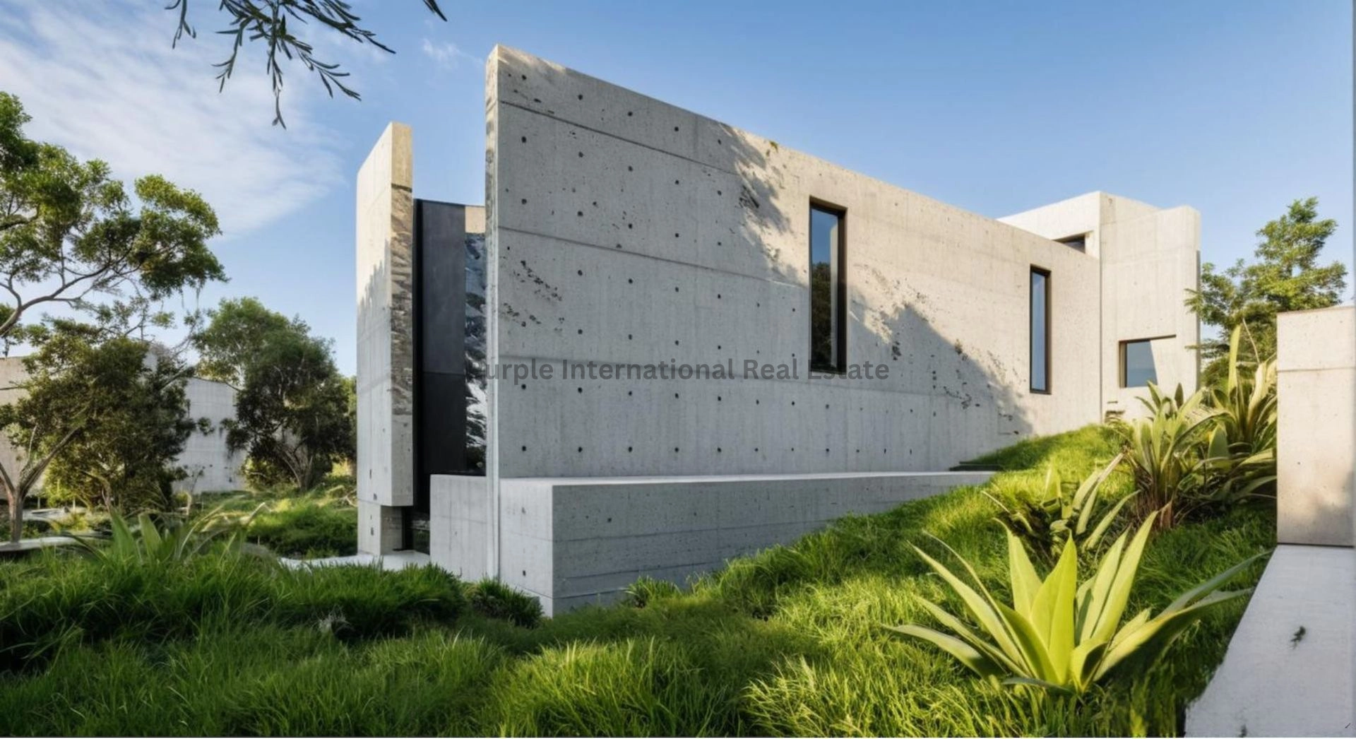 With a main house boasting 3 bedrooms, master with full walk-in wardrobe and ensuite, office, large open plan living/kitchen/dining with aggressively angled Bespoke island and a dramatic 3-story hall where your eye is gently drawn across the pool to the sea view horizon. Downstairs you’ll find the cinema/gym with utility and a private fully self-contained 1-bedroom apartment for guests or the maid. From here, access the garden with sunken seating and BBQ area with Pergola, floating steps, and a sweeping high sound barrier wall to the north.