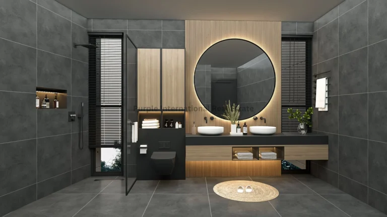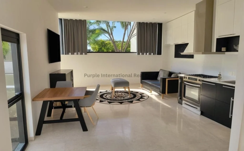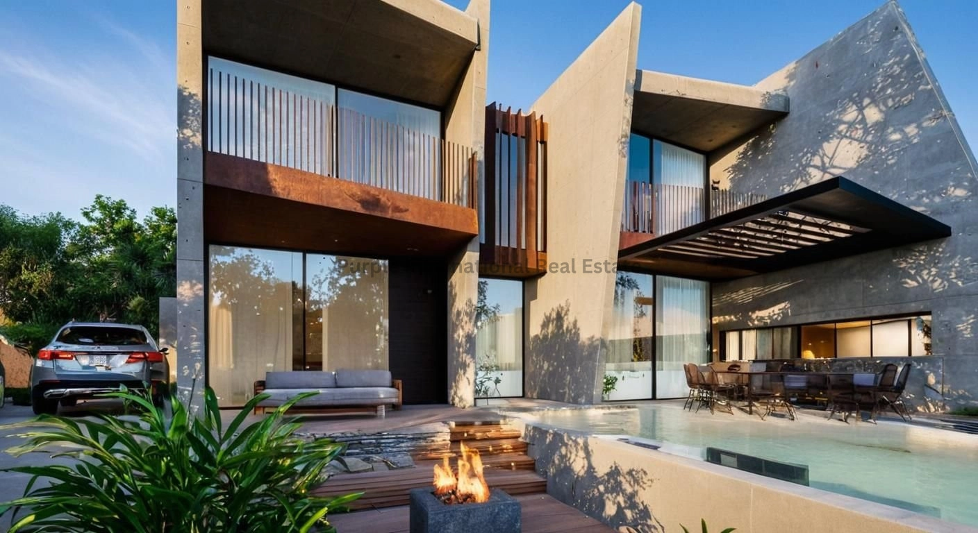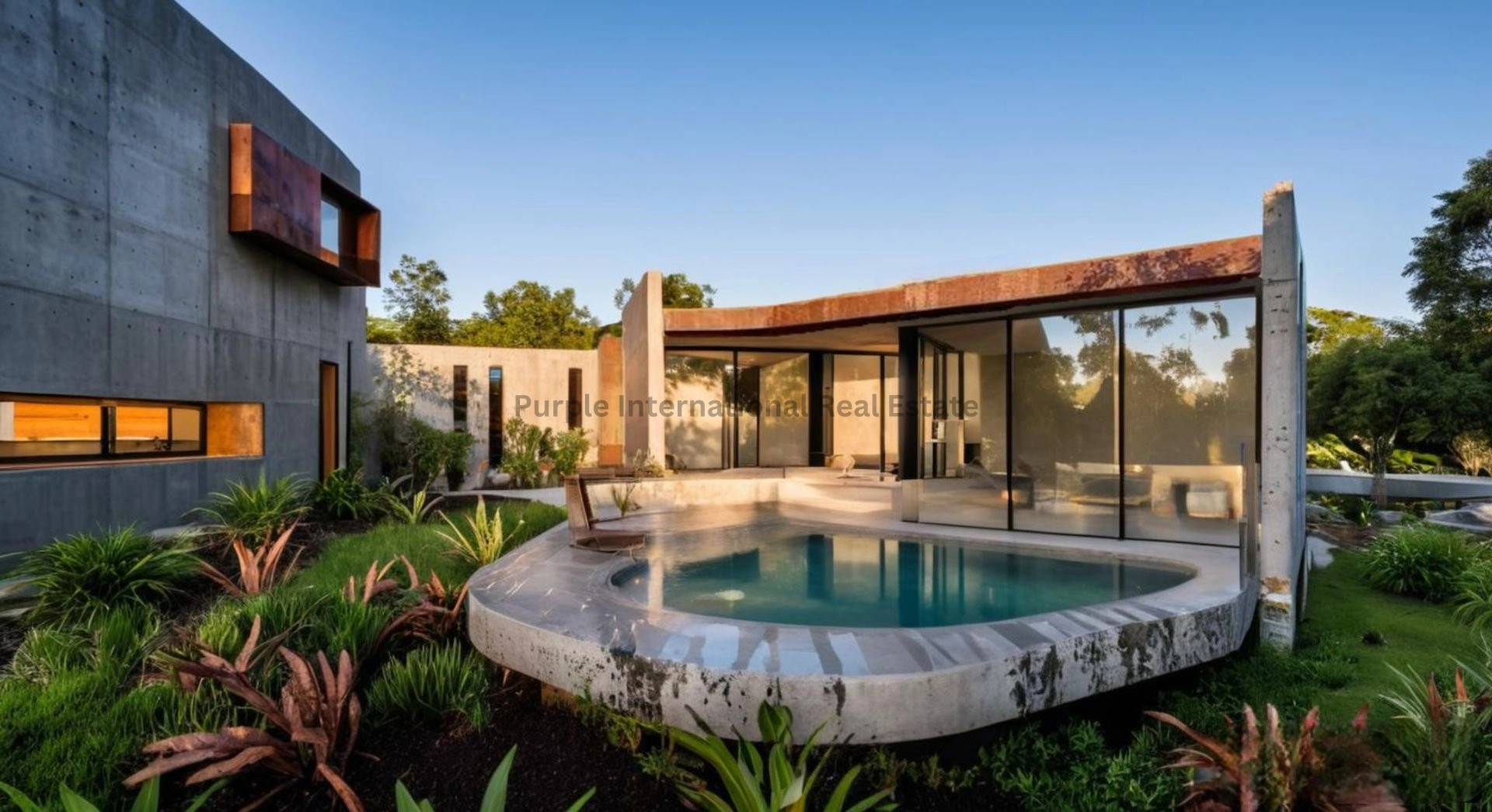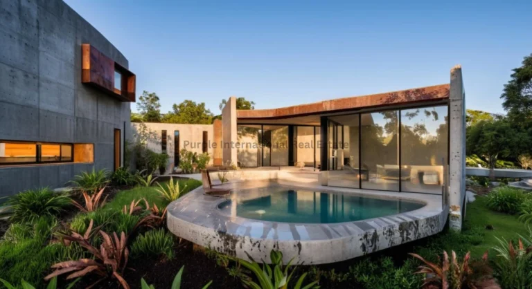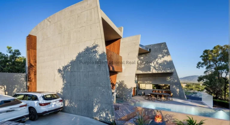 With a main house boasting 3 bedrooms, master with full walk-in wardrobe and ensuite, office, large open plan living/kitchen/dining with aggressively angled Bespoke island and a dramatic 3-story hall where your eye is gently drawn across the pool to the sea view horizon. Downstairs you’ll find the cinema/gym with utility and a private fully self-contained 1-bedroom apartment for guests or the maid. From here, access the garden with sunken seating and BBQ area with Pergola, floating steps, and a sweeping high sound barrier wall to the north.