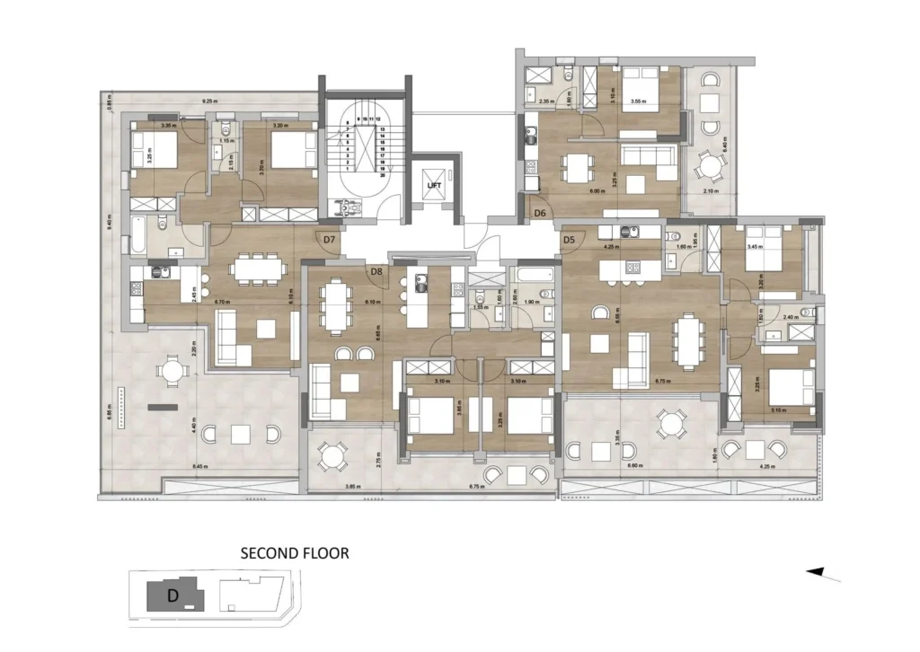 Two-bedroom apartment D8, with an internal area of 85 m², is located on the second floor of a four-storey building.