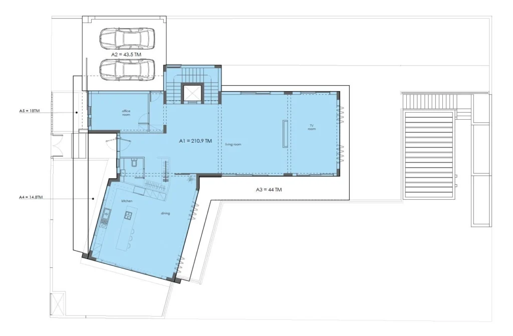 On the Ground floor, 315,6 m² – Office, TV room, Living room, Kitchen and dining area, Pantry, Walk-in wardrobe, Guest toilet, Server room, Elevator, Parking for 2 cars, Large covered veranda, Garden.