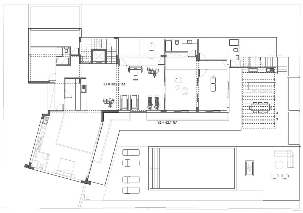 On the Lower Level, 308,6 m² – Maid’s quarter including the kitchen and en-suite; Sauna, hammam, spa room, massage room; Gym; Laundry room; 2 shower rooms; 2 storage rooms; Wine cellar; Game or cinema room; BBQ area; Swimming pool, Garden.